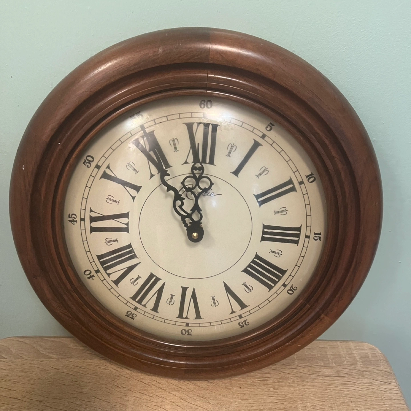 Selling a vintage wall clock with a solid wood case. It has a classic design with Roman numerals. It would look great in any room!