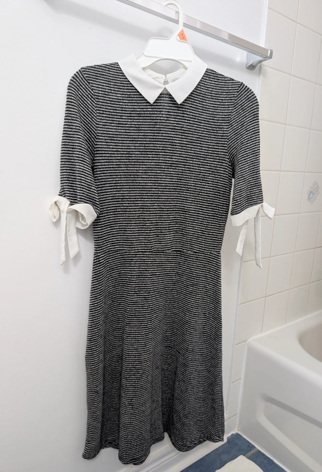A cute striped dress featuring a white collar and bow details on the sleeves! It's in great condition and ready for a new home. The dress has a classic and stylish look that's perfect for various occasions. Feel free to reach out if you have any questions or would like to see more photos. Great for fall season.
