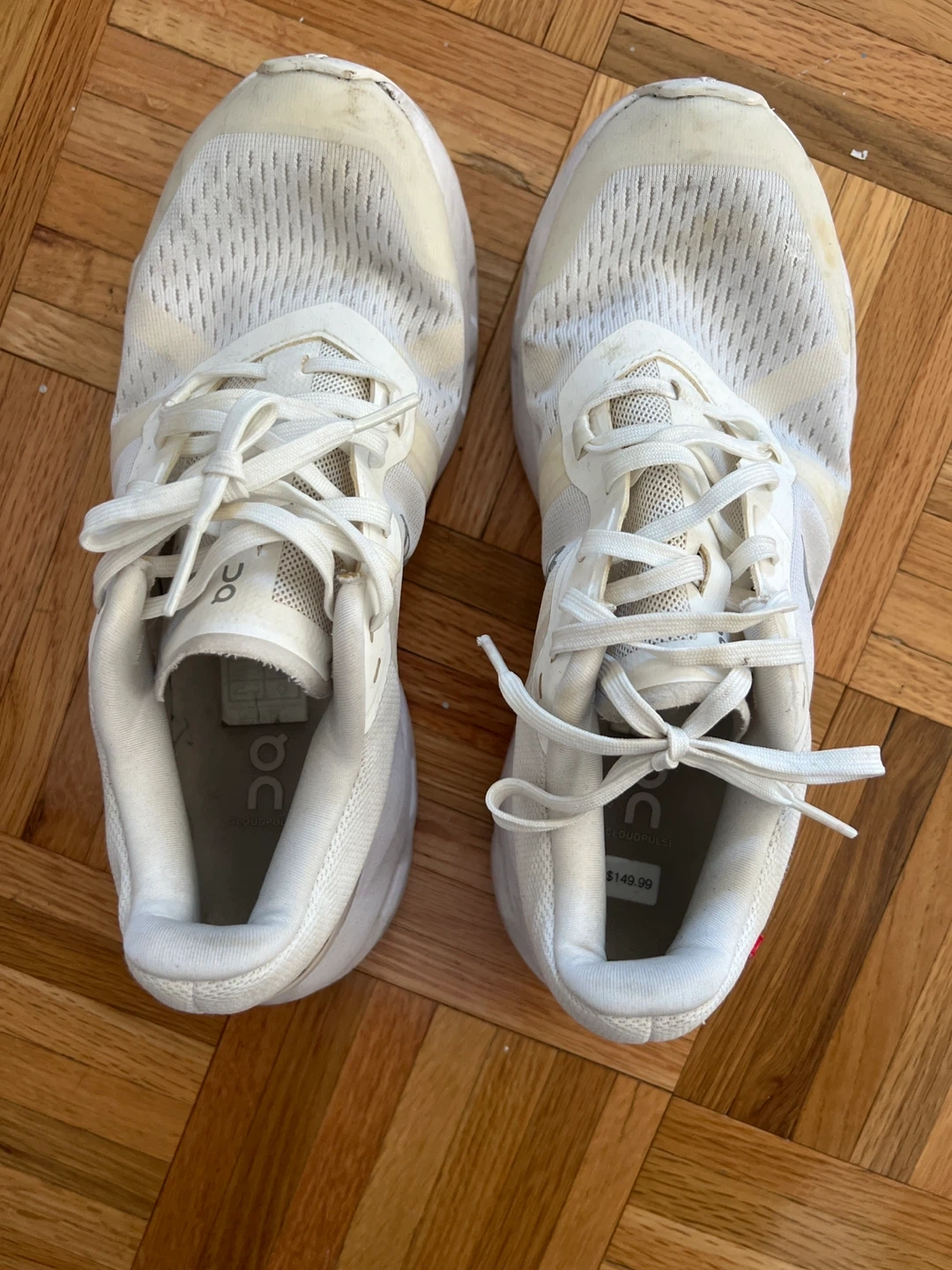 Selling a pair of On Cloud running shoes in white. They are a US women's size 8 / EU 39. Originally bought for $149.99. Great for running or everyday wear! Gently used without any problem.