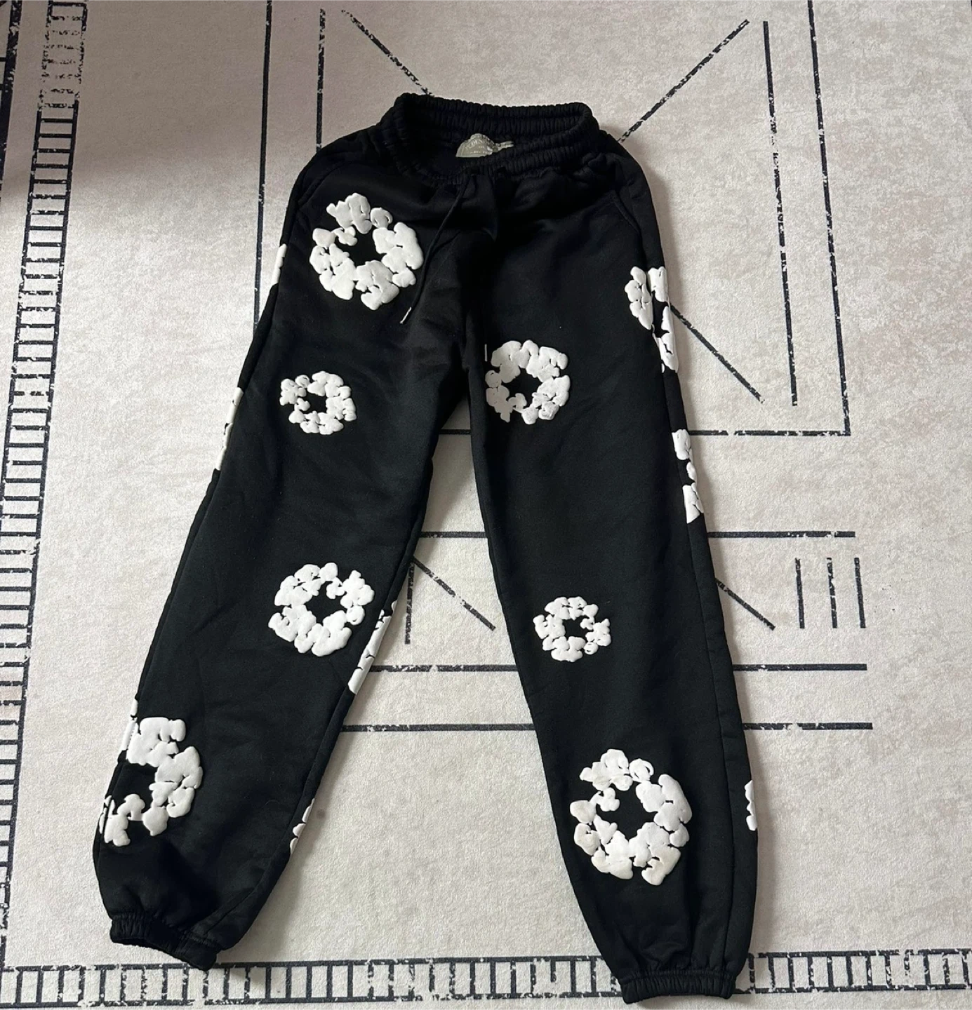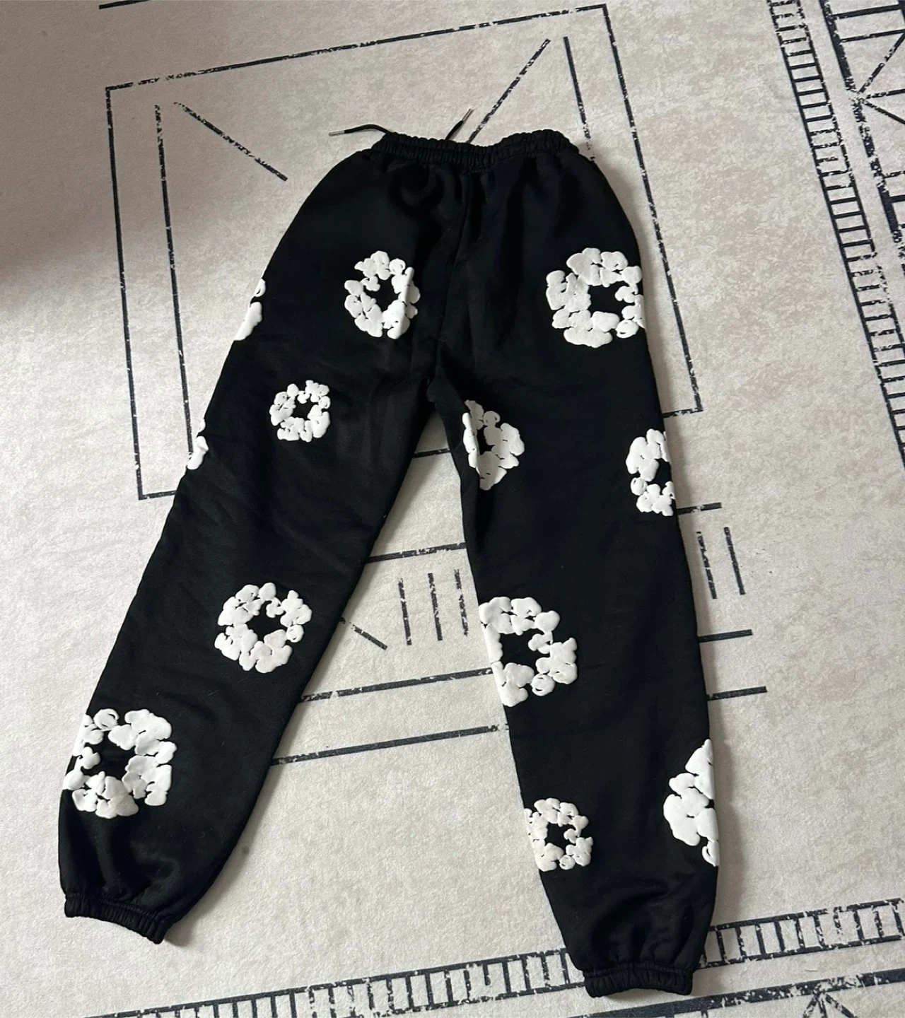 Black sweatpants with white textured floral pattern. Elastic waistband with drawstring. Ribbed cuffs.