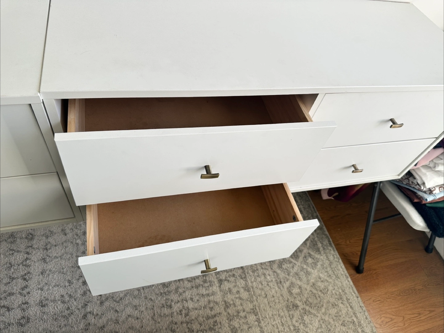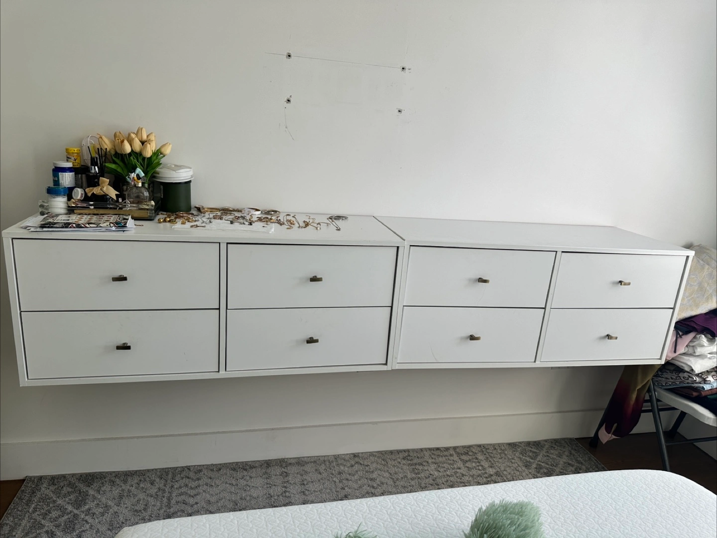 Selling a white floating dresser. It's in great condition and has plenty of storage space! Perfect for a modern and minimalist look in any room. Message me if you're interested!