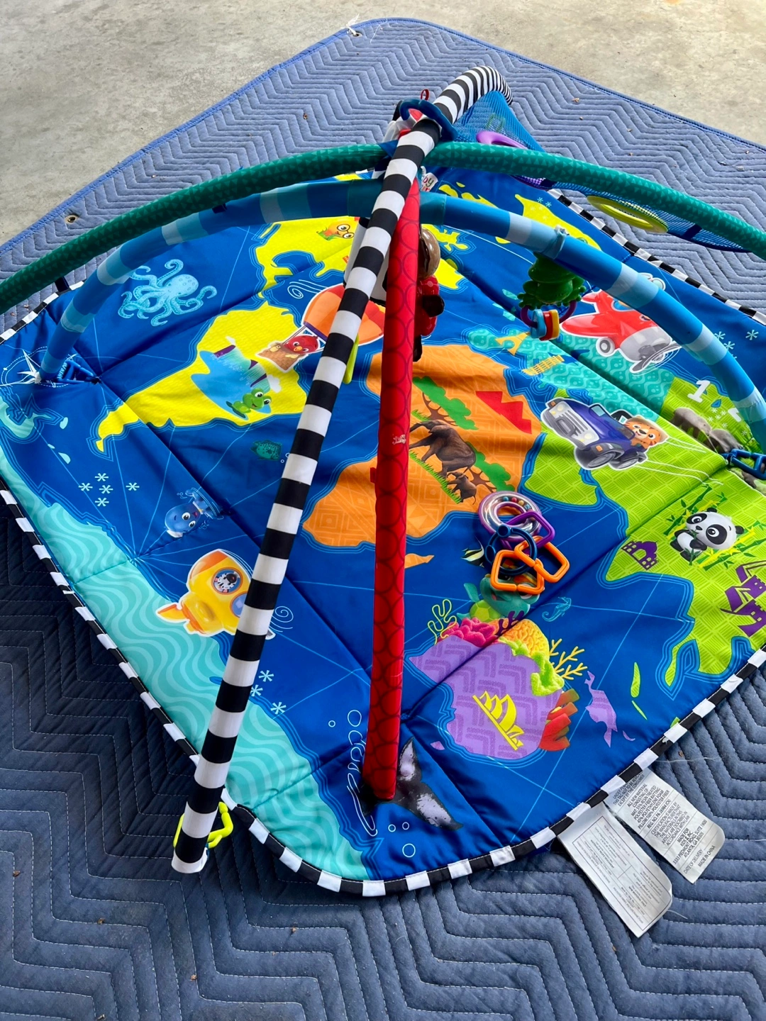 Selling a gently used Baby Einstein Around The World Discovery Gym. It's in great condition and ready for a new little explorer! It features a colourful world map design and includes various hanging toys and accessories to stimulate your baby's senses and development. Recommended for ages 0+.