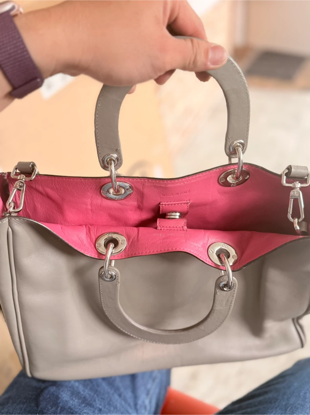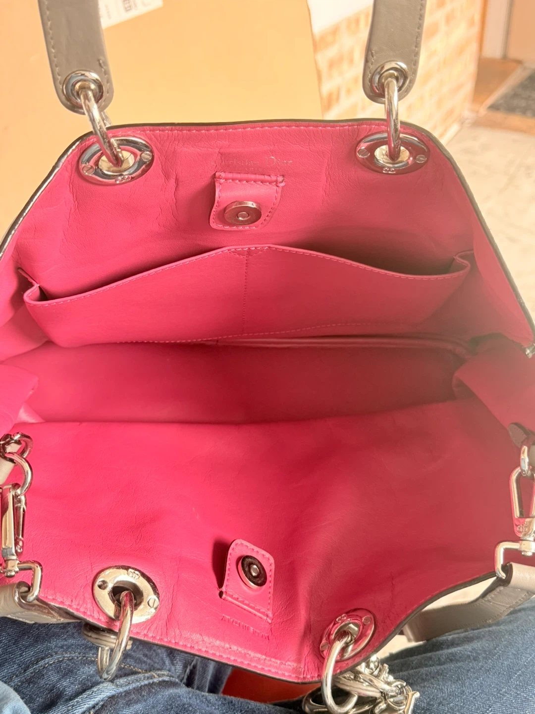 Selling a Dior tote bag in gray leather. It's in great condition and has a pink interior. Perfect for everyday use!