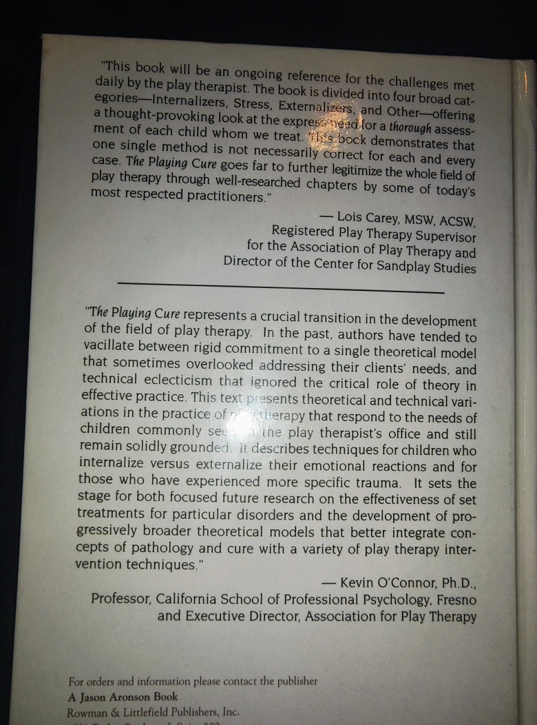 Selling "The Playing Cure: Individualized Play Therapy for Specific Childhood Problems" edited by Heidi Gerard Kaduson, Donna Cangelosi, and Charles Schaefer. This book delves into the field of play therapy, offering insights and techniques for addressing childhood challenges.