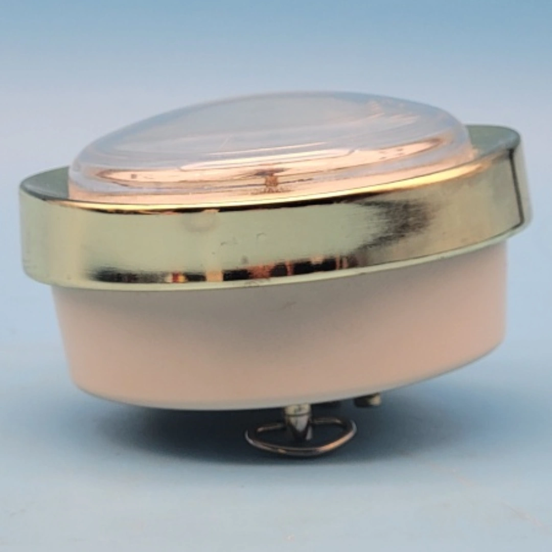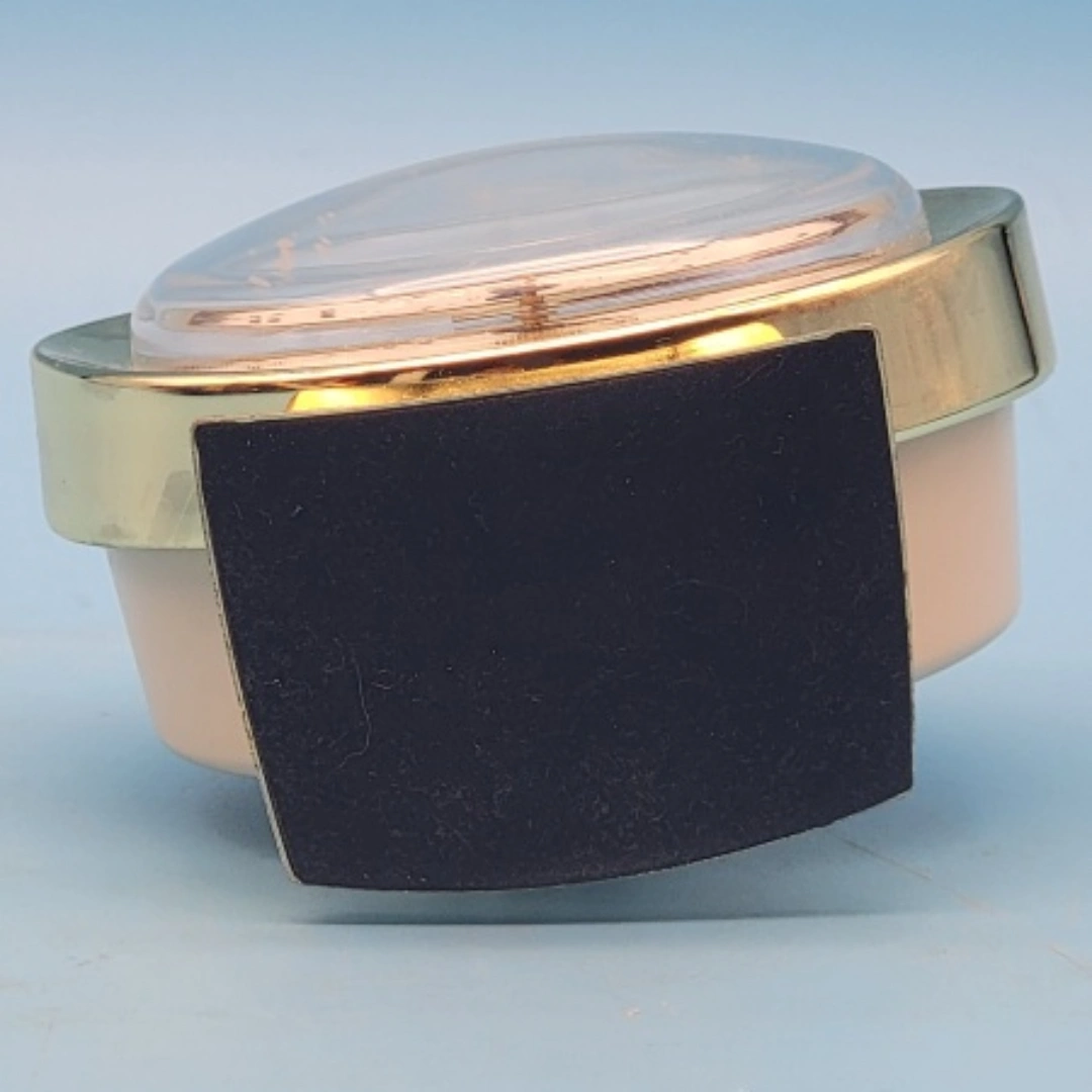 The clock has a beige body made of sturdy metal with gold trim and base.