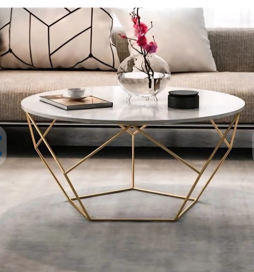 Selling a stylish round coffee table with a unique gold geometric base. It's perfect for adding a modern touch to your living room. The table has a clean, minimalist design that complements any decor. It's in great condition and ready for a new home!