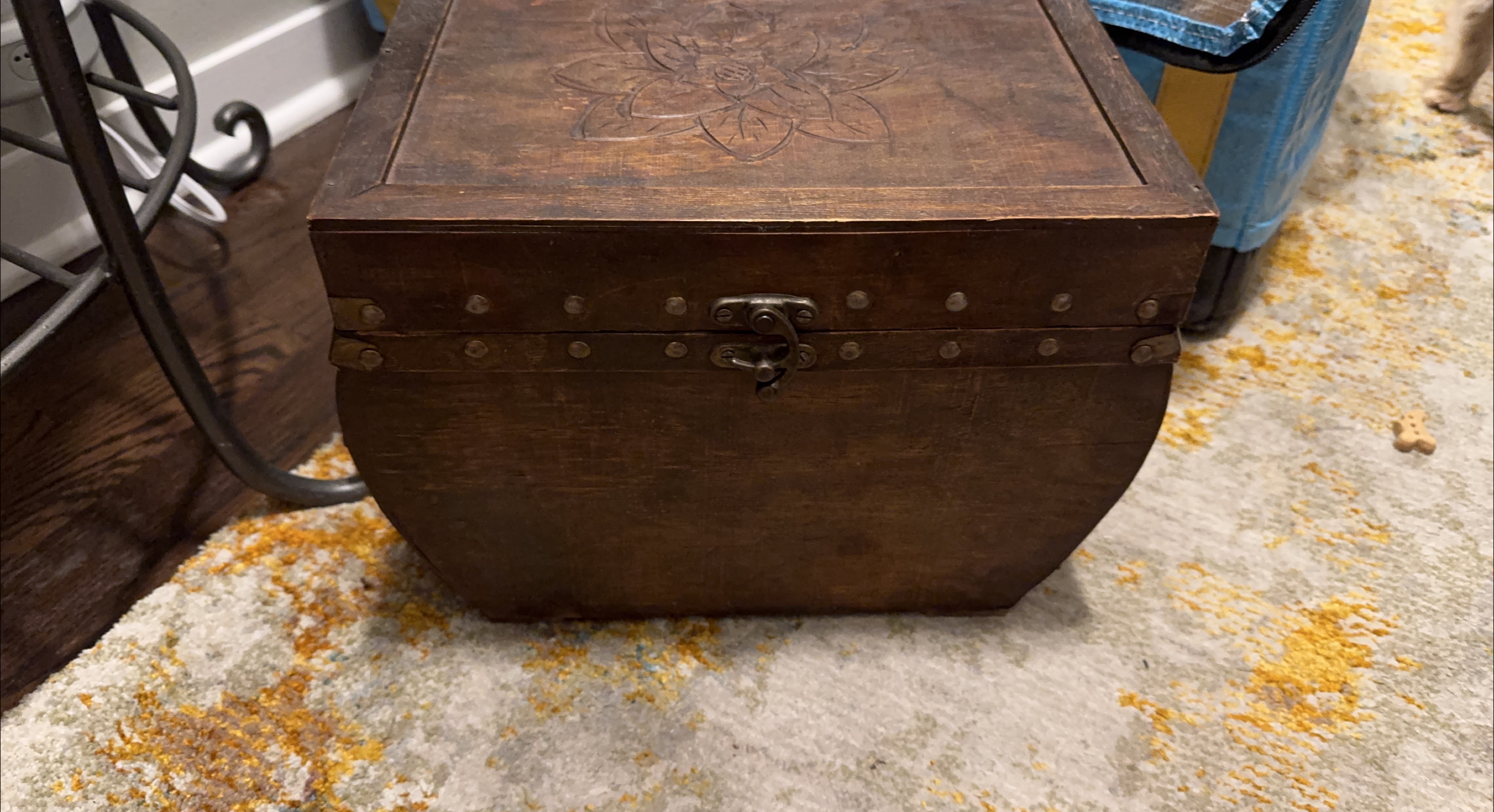 Moving Sale-This is a beautiful decorative wooden storage box. It has a rustic look with metal accents and a floral design on the top. Perfect for storing small items or as a decorative piece in your home! Pick up Only