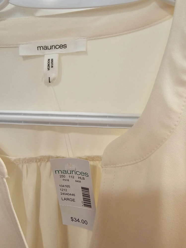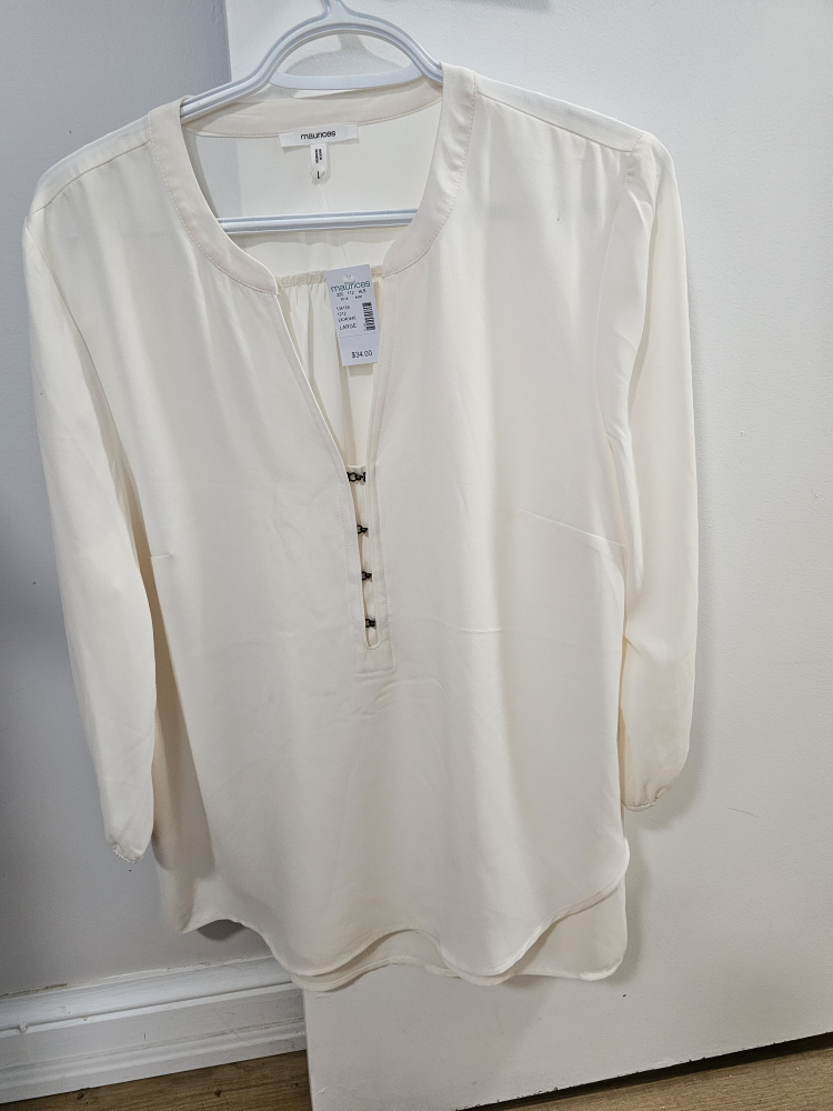 A lovely cream-coloured blouse from maurices in size large! It's in great condition and ready for a new home. Perfect for dressing up or down, it's a versatile addition to any wardrobe