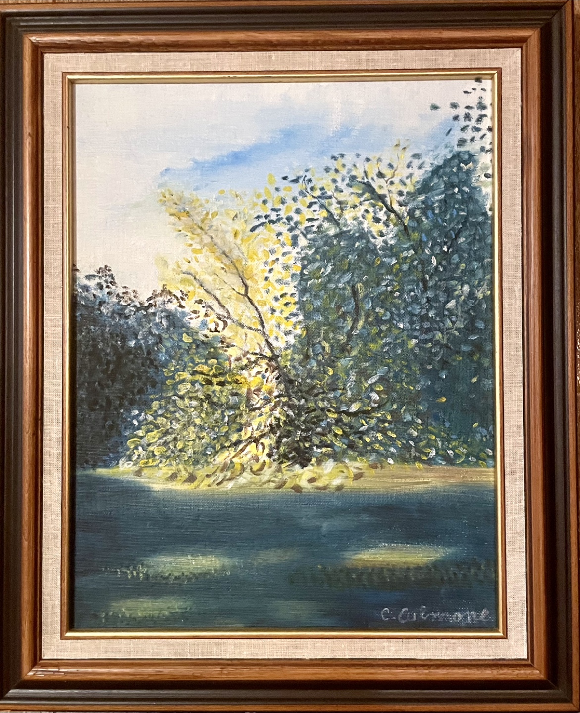 This framed acrylic landscape painting depicts a sunlit scene near Giverny, France. The painting captures the play of light on and through the trees, a characteristic element of impressionist style. $25 or best offer.