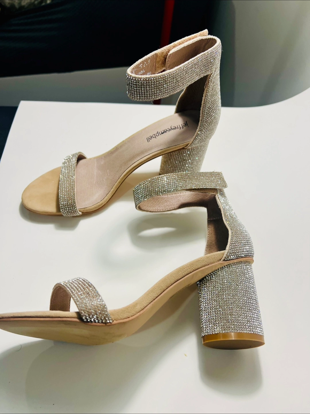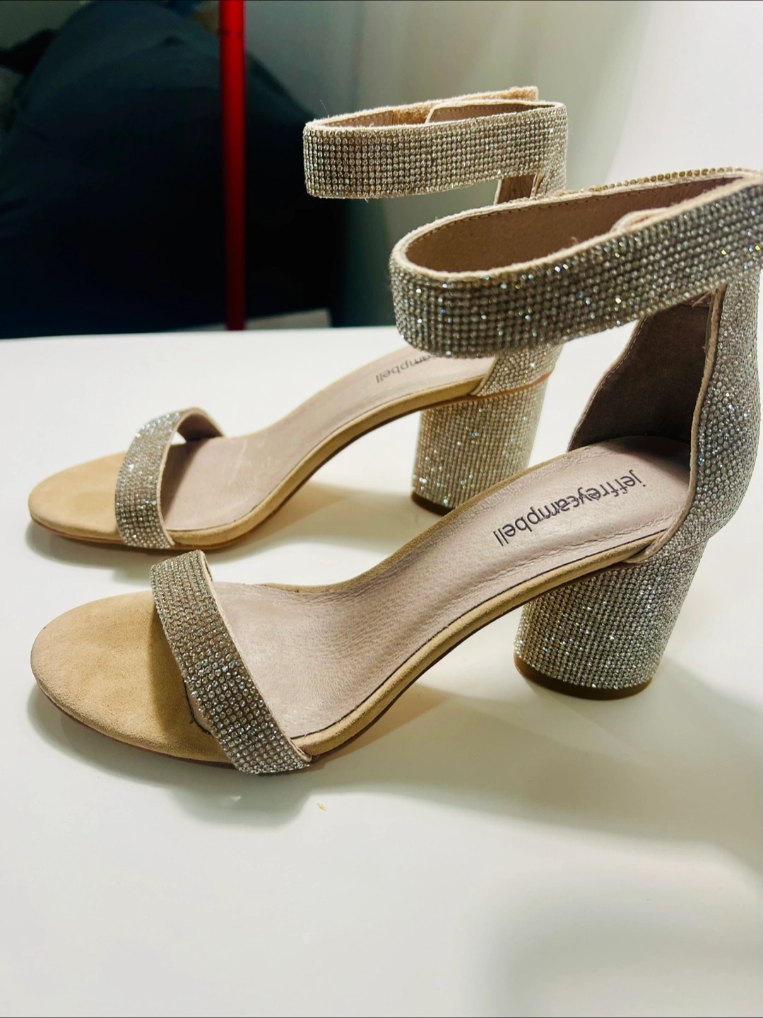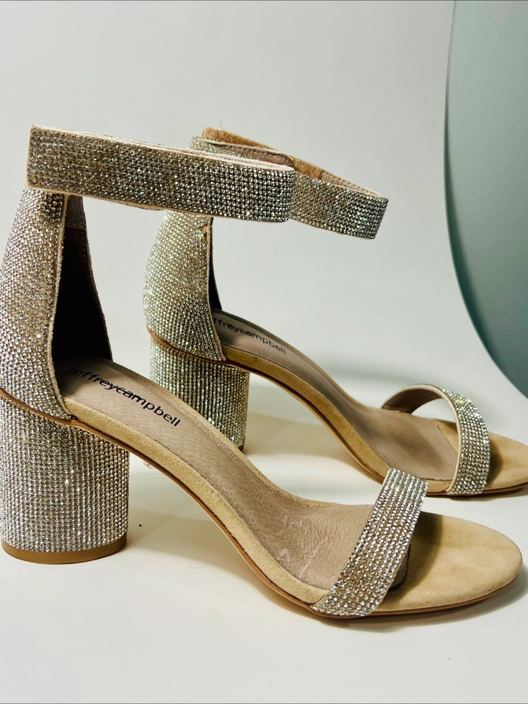 These are a pair of Jeffrey Campbell heels, perfect for adding a touch of sparkle to any outfit! The heels feature a chunky heel and ankle strap, both embellished with rhinestones.