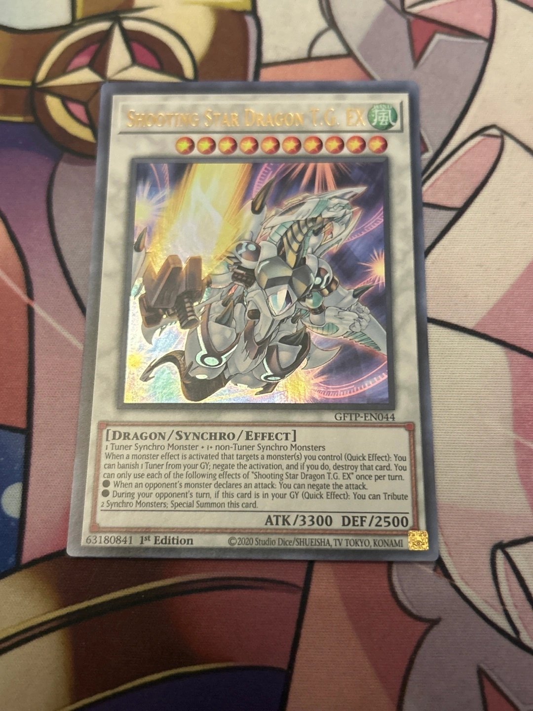 Selling a Shooting Star Dragon T.G. EX Yu-Gi-Oh! card. This card is a Dragon/Synchro/Effect monster. It has an ATK of 3300 and a DEF of 2500. It's a 1st Edition card from 2020!