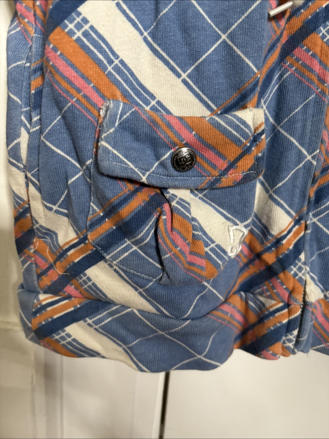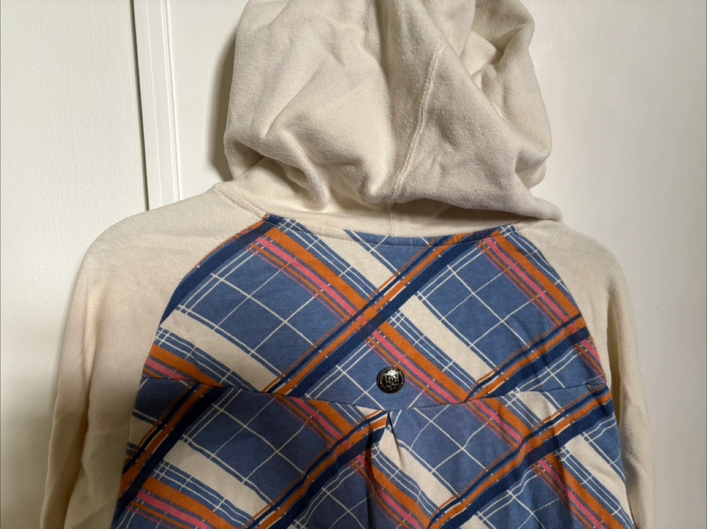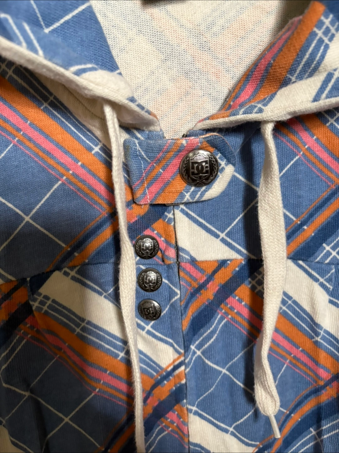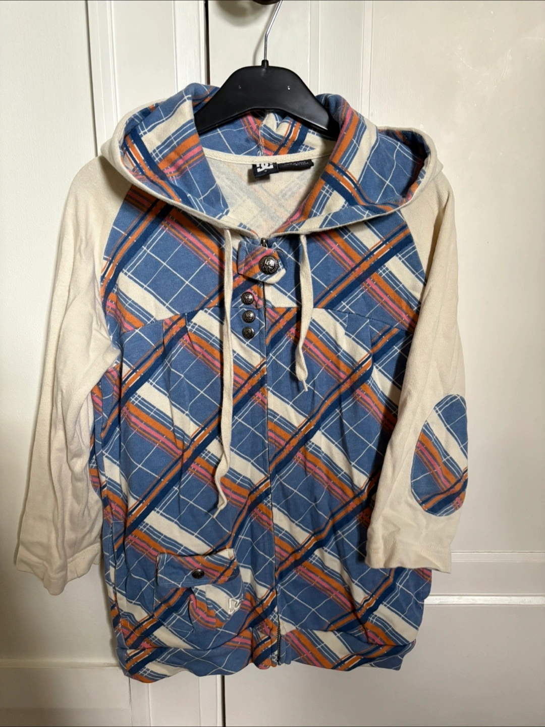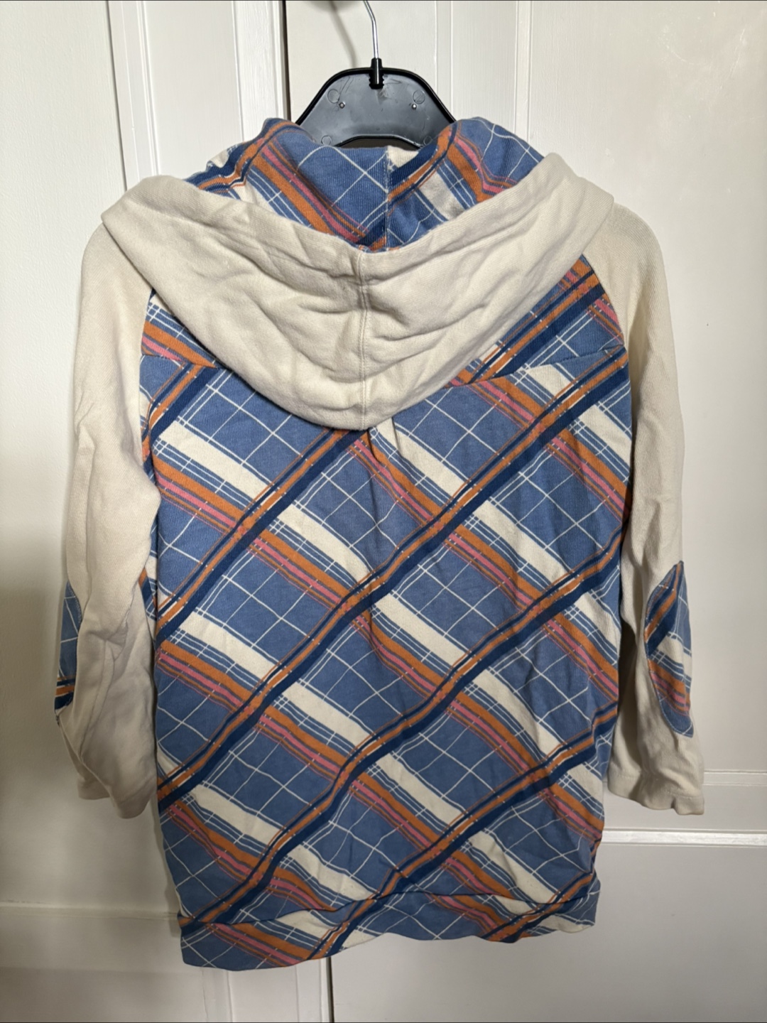 Super cute plaid hoodie with button details. 100% cotton. Features a drawstring hood. 3/4 sleeve with decorative elbow patches. Side pockets, plus a cute small pocket on the front. Perfect condition. Comfortable and trendy design. Great back to school purchase!