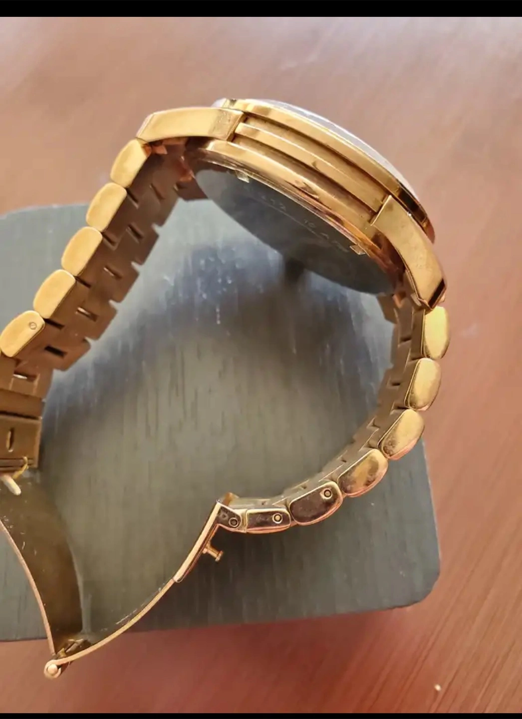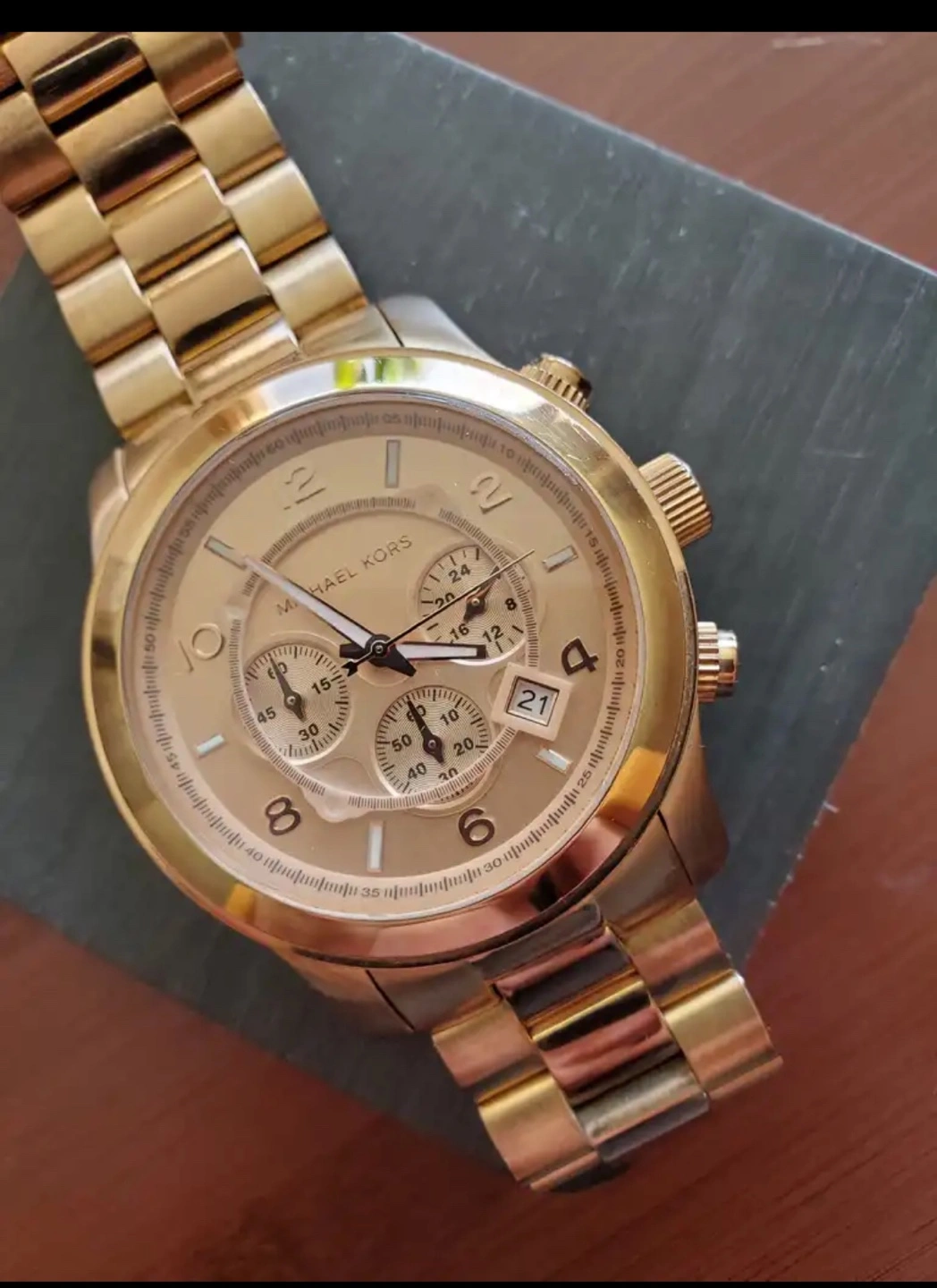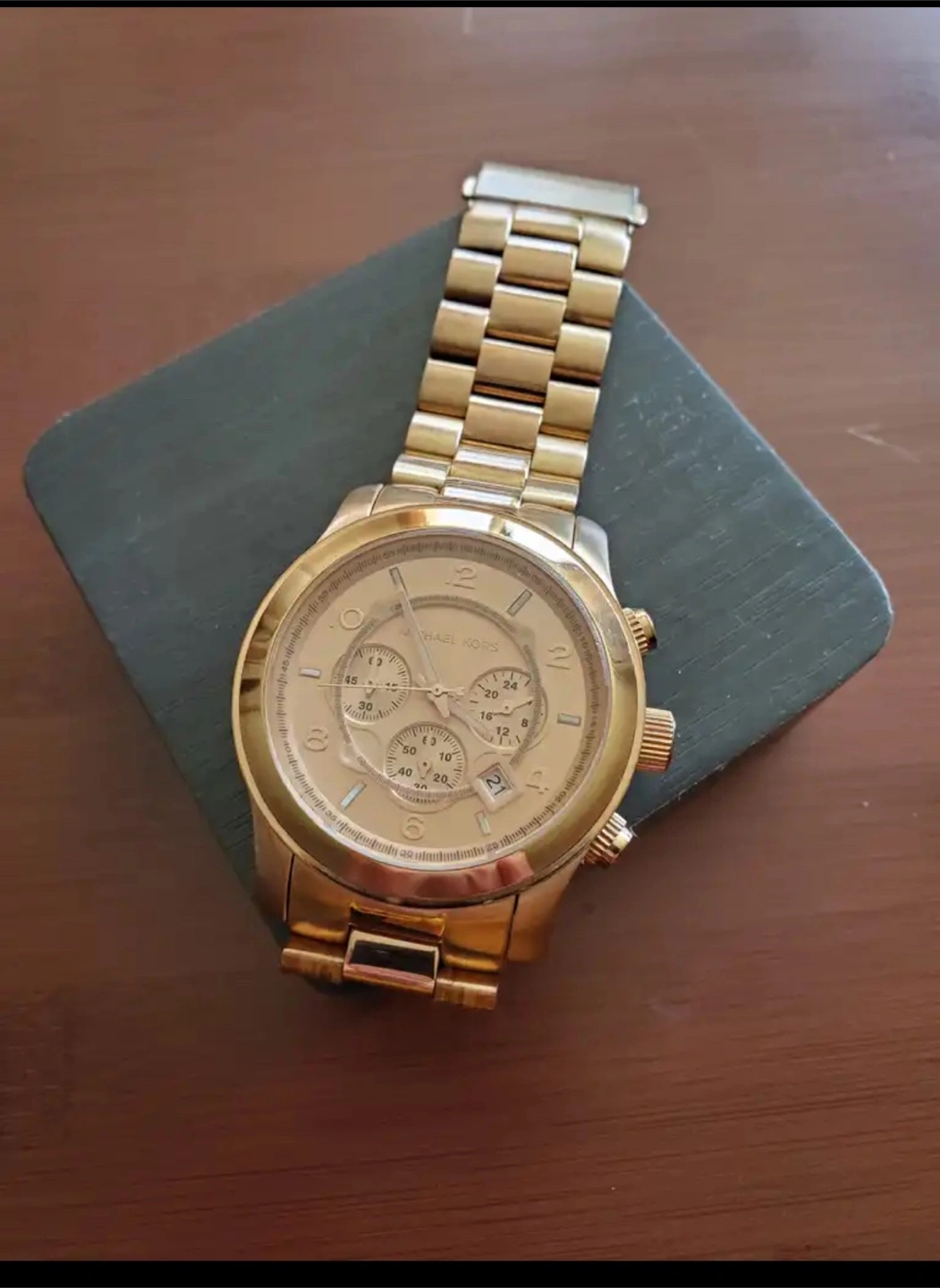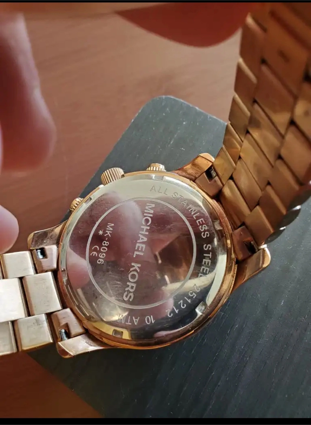 Selling a Michael Kors MK-8096 watch. It is gold in color and has a stainless steel back. The watch is in good condition and ready for a new owner! needs a new battery.