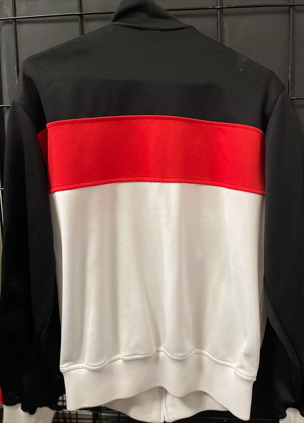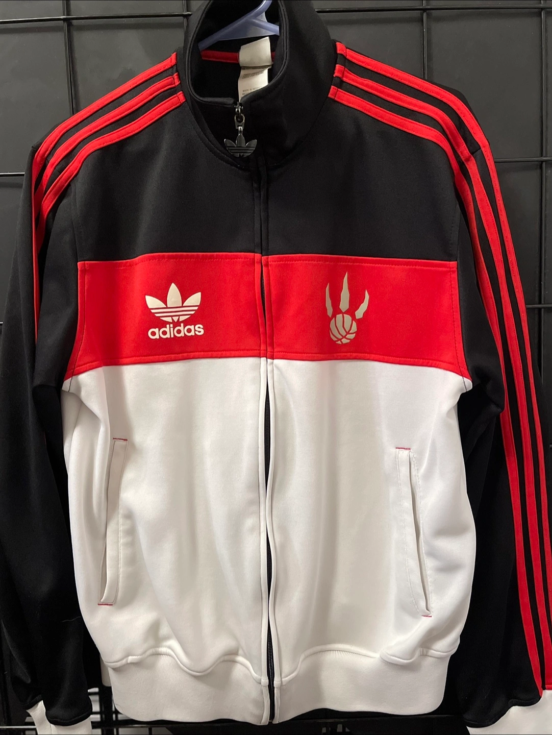 Selling an Adidas Toronto Raptors track jacket! It features the classic Adidas stripes down the sleeves and the Raptors logo. The jacket is black, red, and white. Perfect for any Raptors fan!