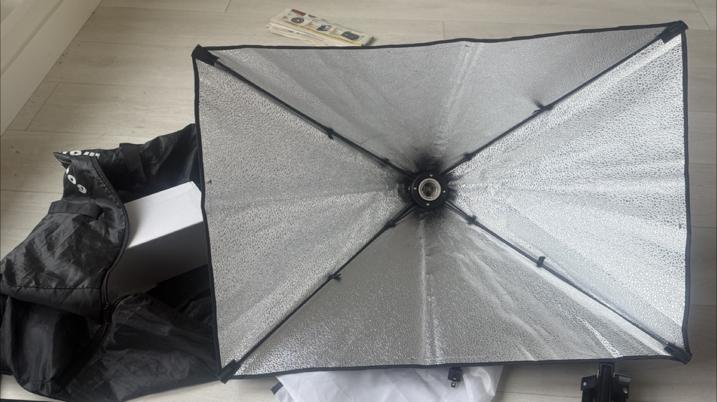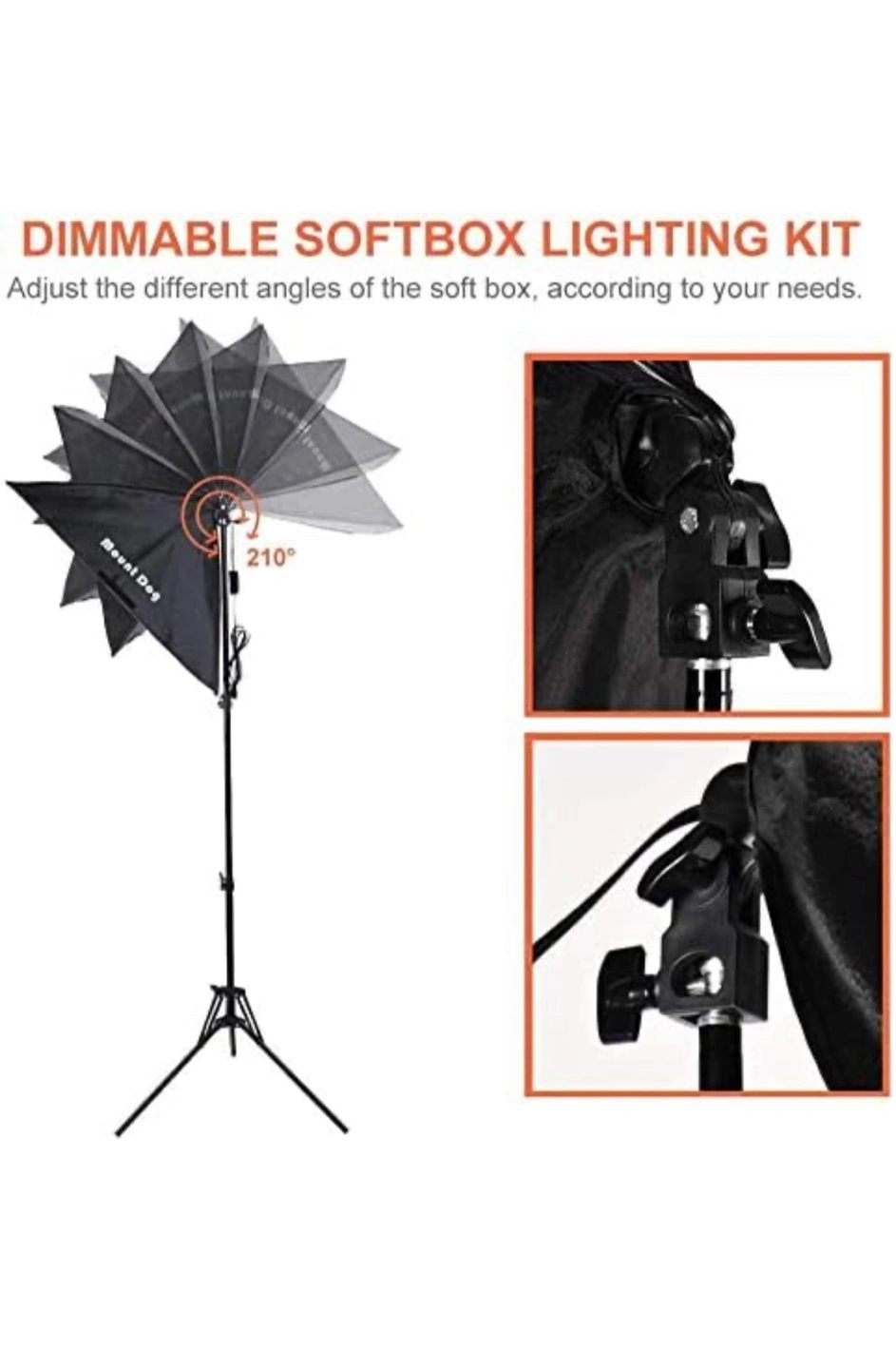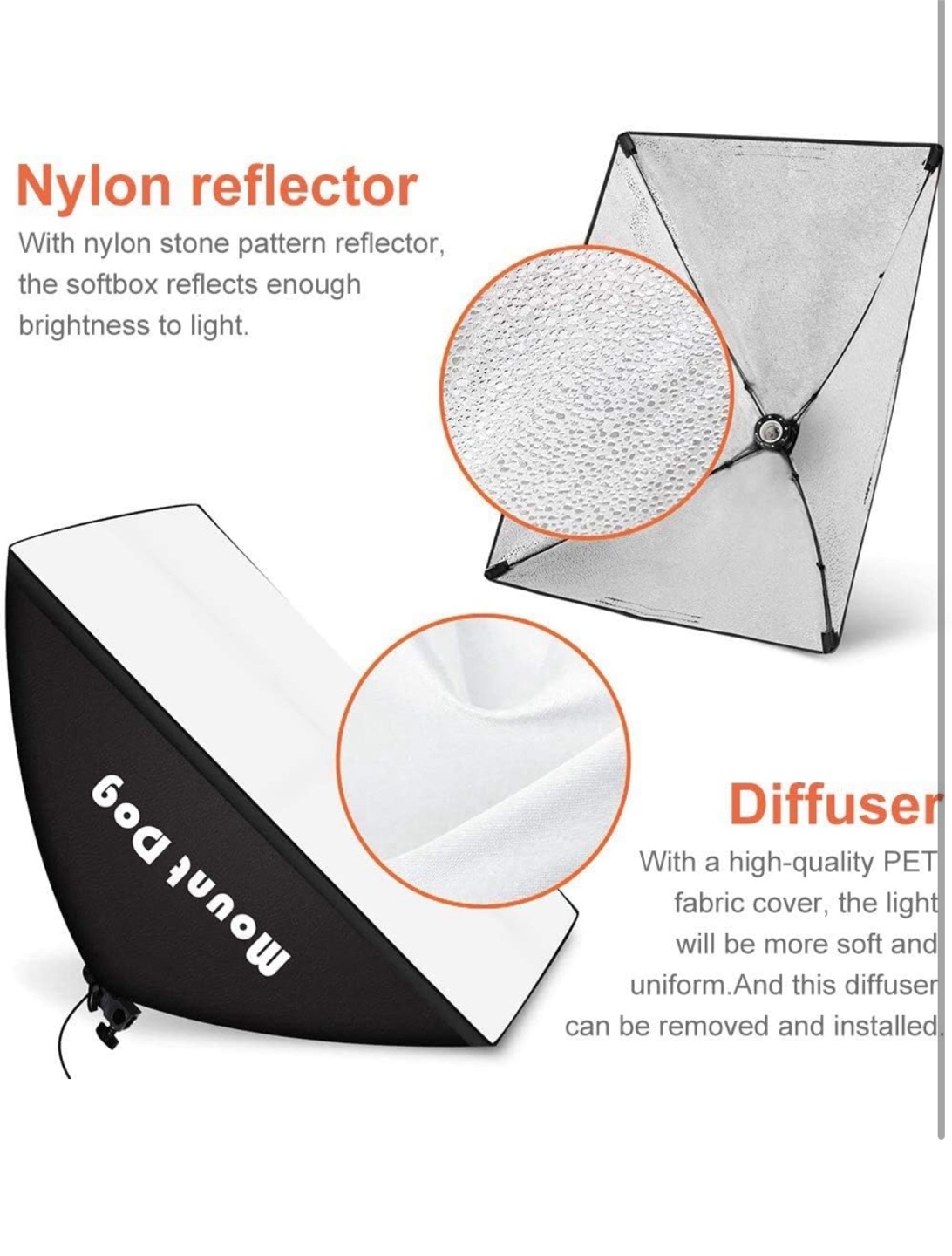 I'm selling a Mount Dog softbox lighting kit! It includes a nylon stone pattern reflector, which helps the softbox reflect enough brightness for your lighting needs. The diffuser is made with a high-quality PET fabric cover, ensuring soft and uniform light, and it's also removable and easy to install. Comes with the carrying bag