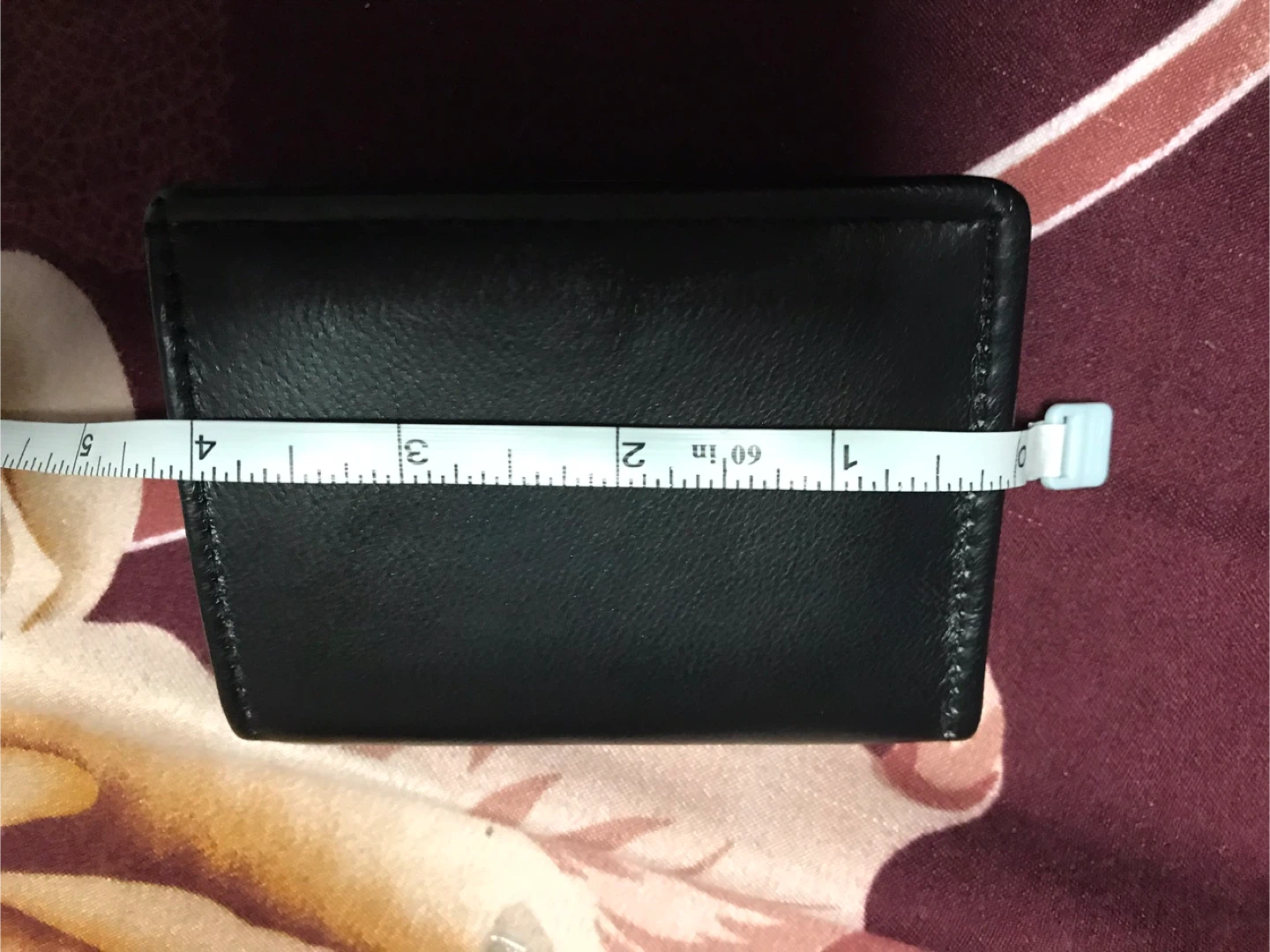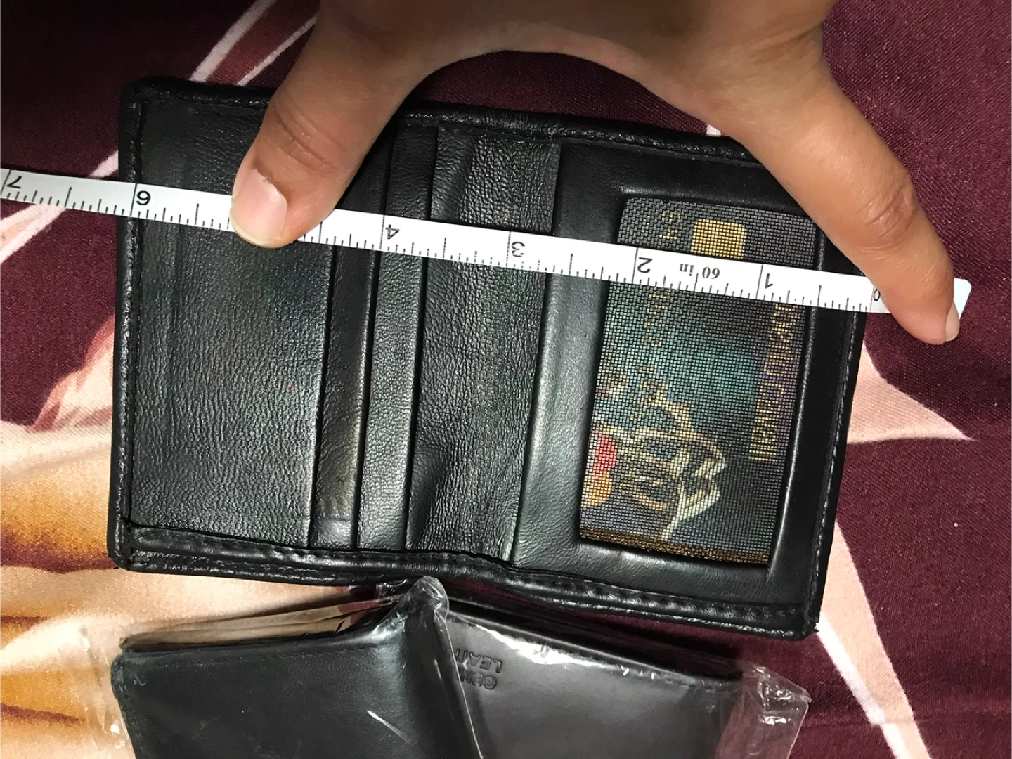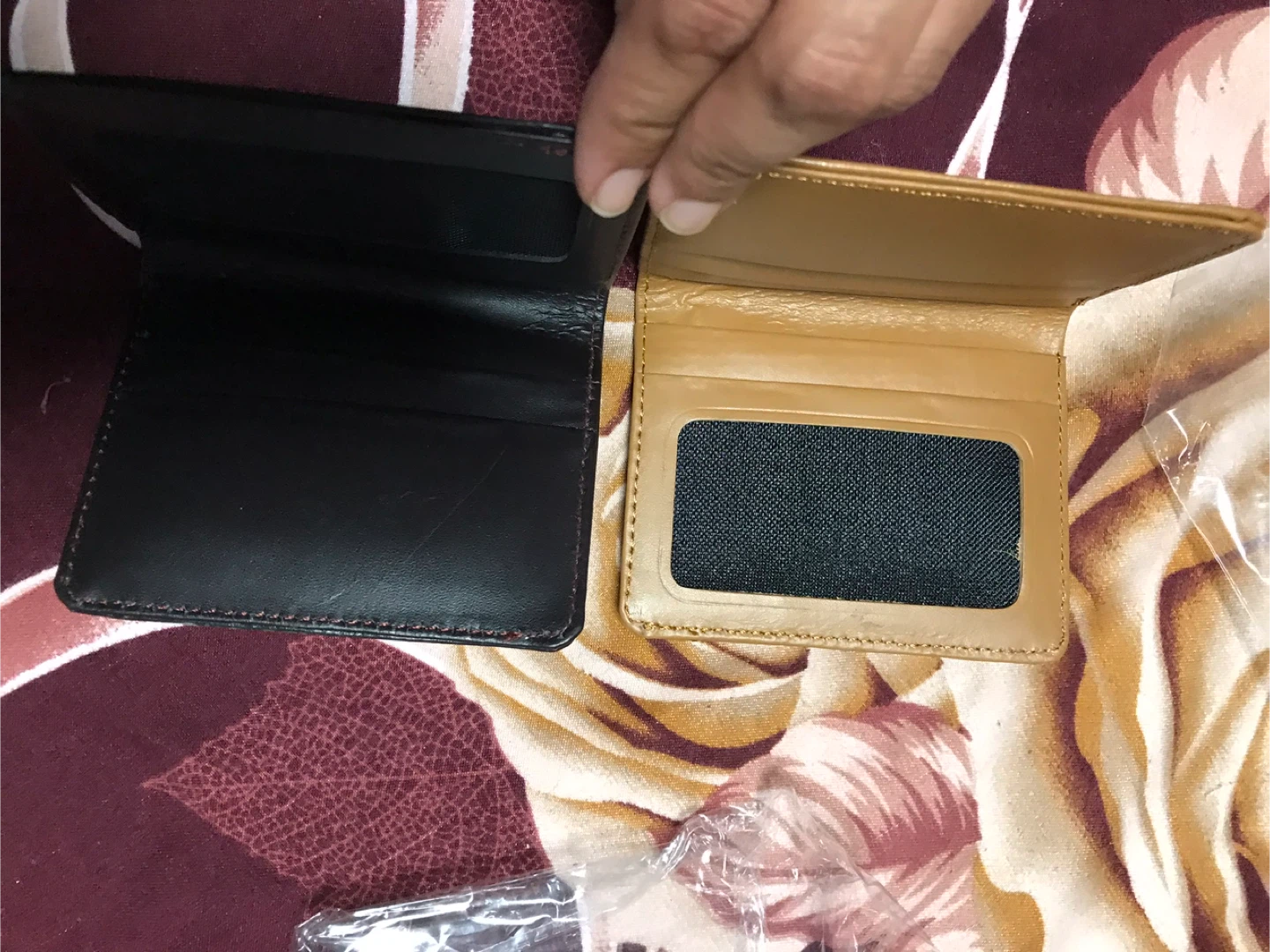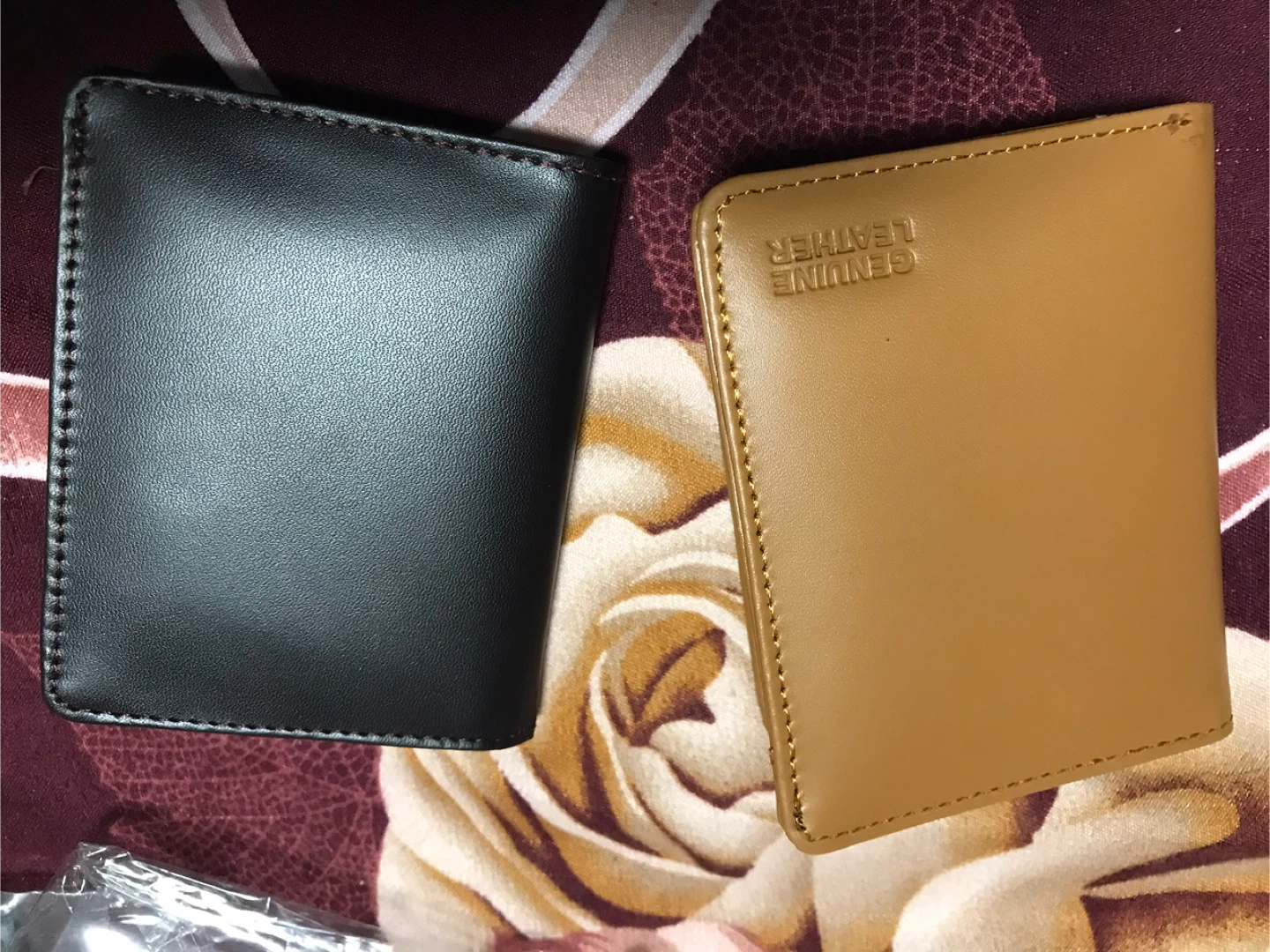 Selling leather bifold wallets. One is black and the other is tan. They each measure approximately 4 inches wide when closed. Perfect for everyday use
