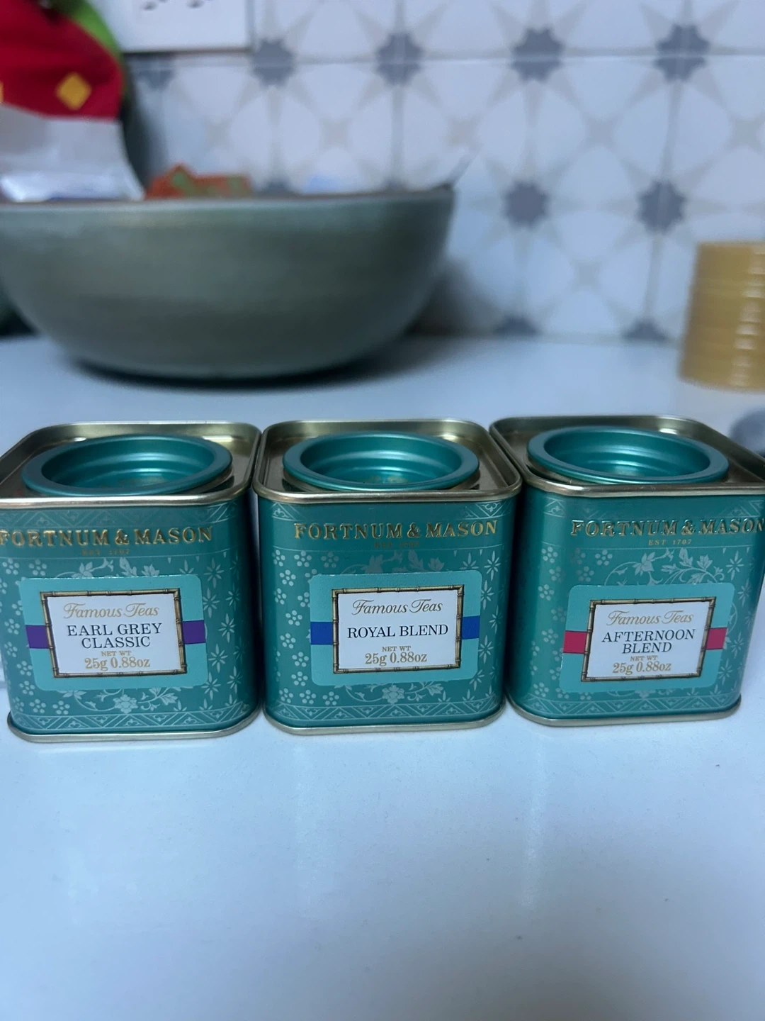 Three collectible tins of Fortnum & Mason teas: Earl Grey Classic, Royal Blend, and Afternoon Blend. Each tin contains 25g (0.88oz) of tea. Beautifully designed for gifting or personal enjoyment!