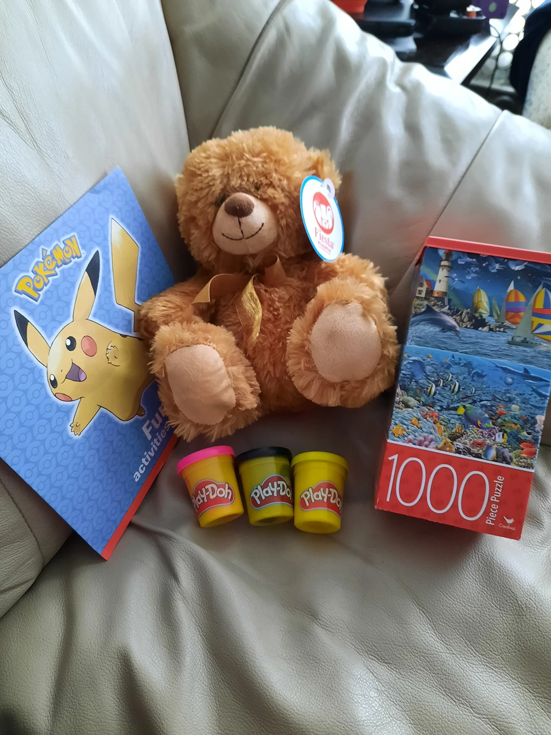 Includes: 1 Brand new bear plush, 1 Unopened 1000 PC puzzle, 3 unopened playdoughs (colors:bright pink, black and chartreuse) and Unopened Mcdonalds Pokemon activity sheets.