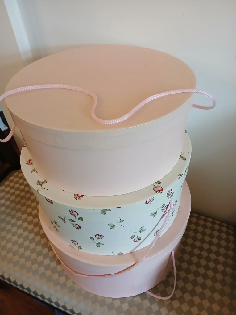 Selling a set of three stacking hat boxes. They're in great condition and would be perfect for storing hats or other delicate items. The boxes are round and come in a mix of solid pink and floral patterns. A charming addition to any closet or storage space!