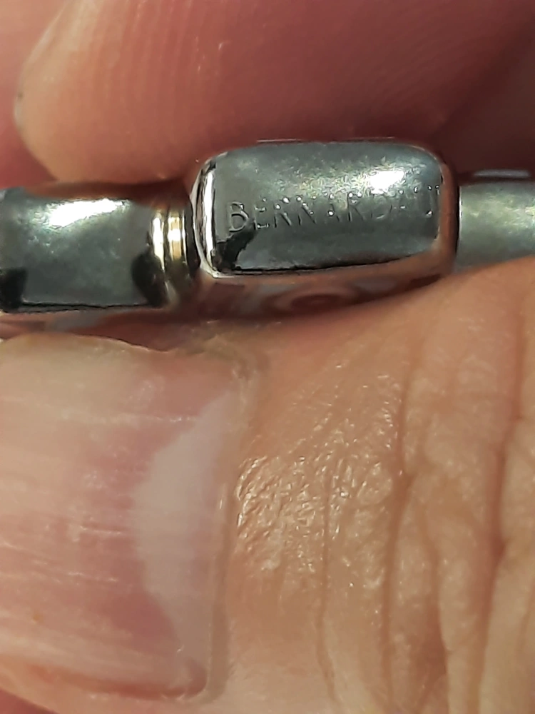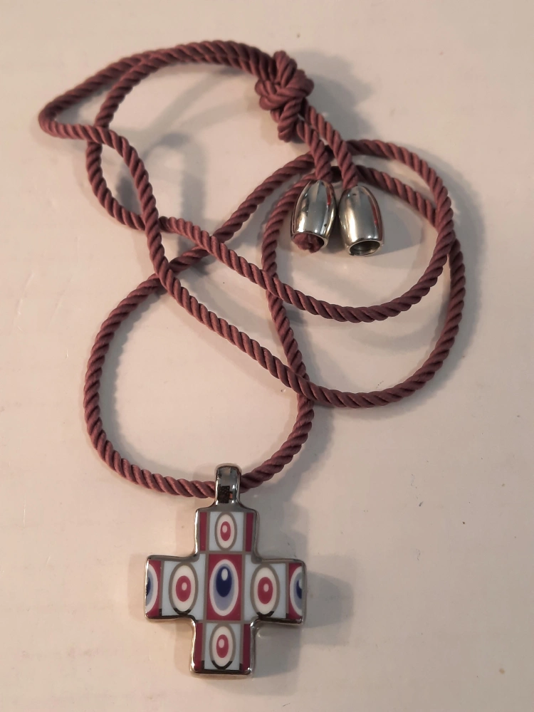 This is a Bernardaud cross pendant necklace. It features a decorative cross pendant with red, white, and blue accents. It comes with a burgundy-coloured rope style necklace.selling price acording to value .