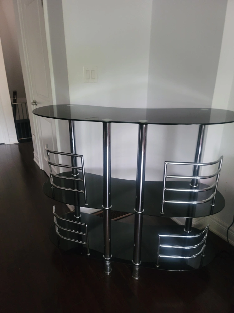 Selling a black glass bar table. It's in great shape and would be a nice addition to any home bar area. Features a sleek design with chrome accents and multiple shelves for storage.