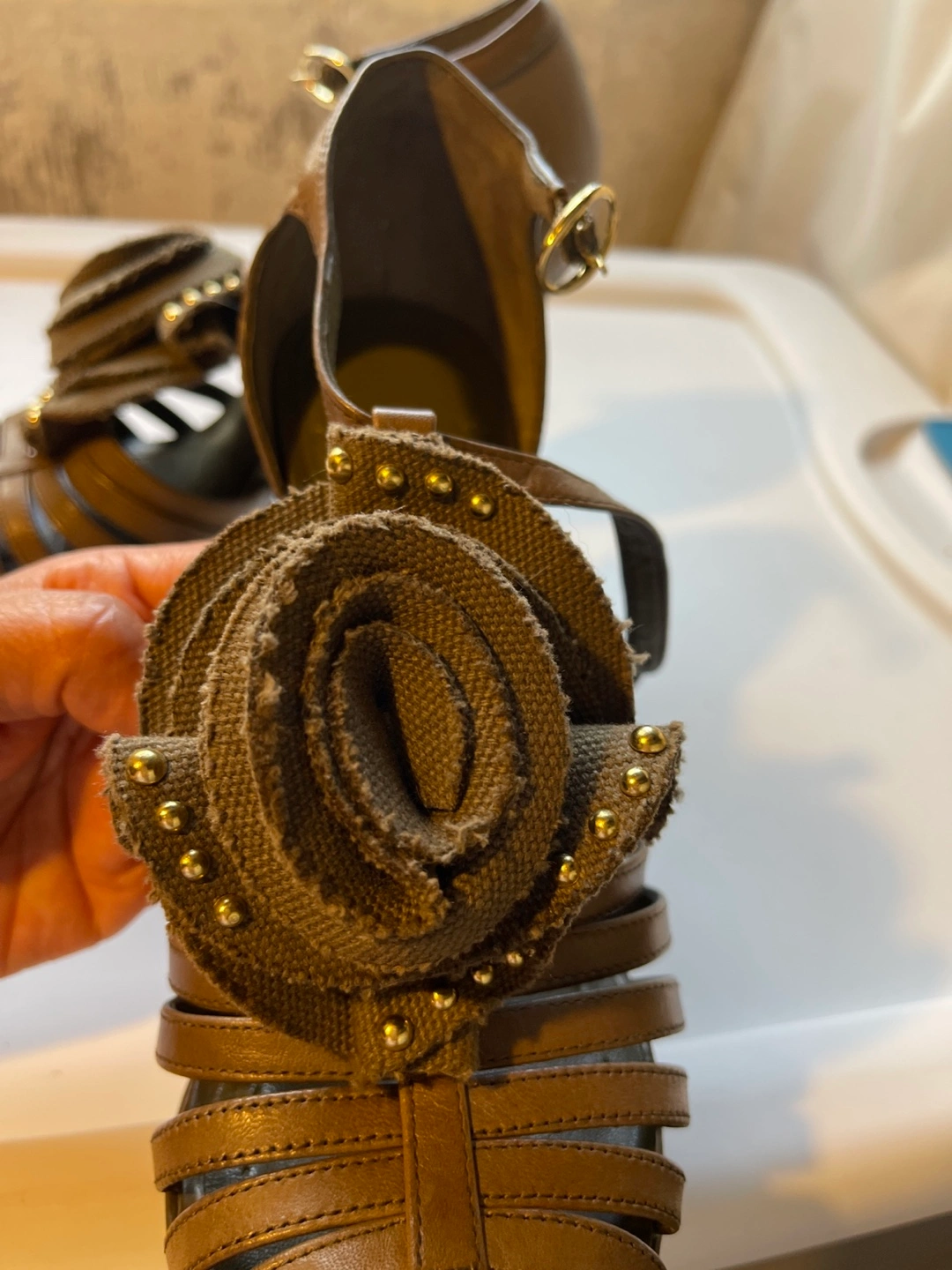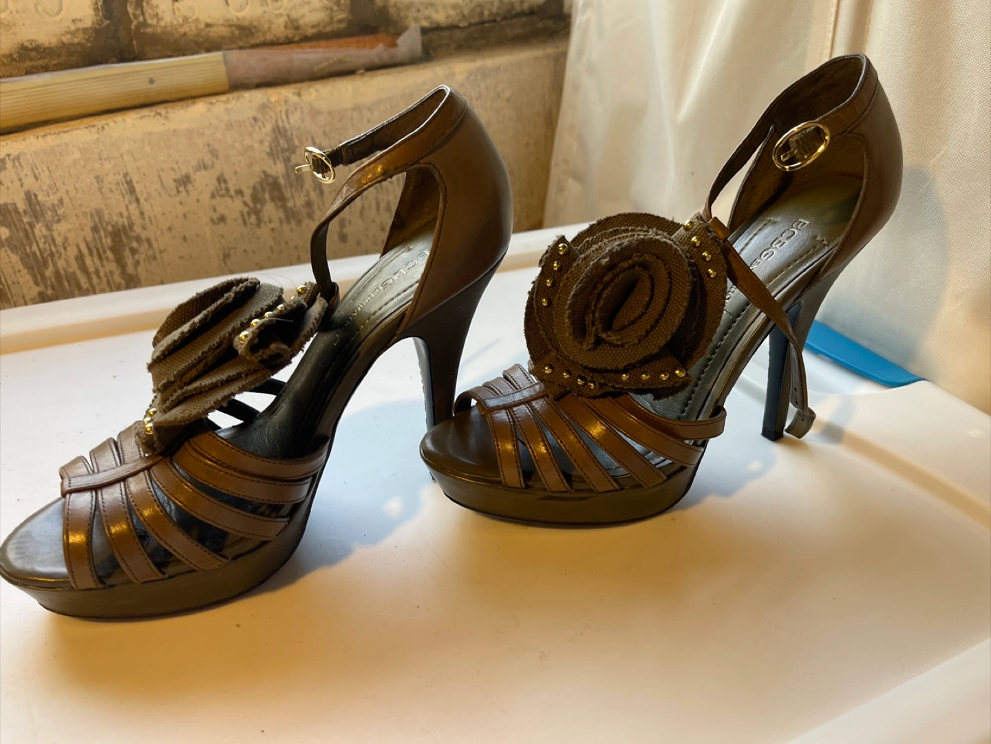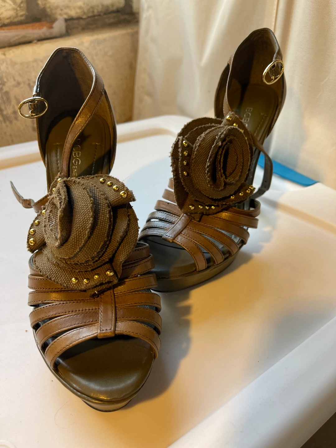 These are a pair of BCBGeneration heels in a stylish brown color! They are size 6.5. These heels feature a unique flower embellishment, adding a touch of elegance to any outfit. Perfect for dressing up or adding a chic touch to your everyday look