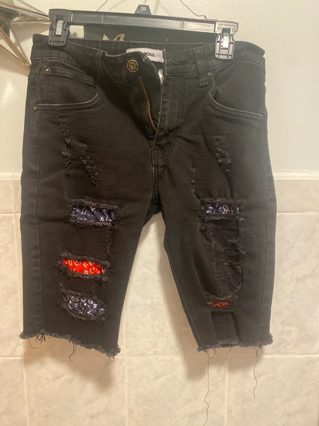 Fashion Nova Men's distressed denim shorts in black. These shorts feature a stylish distressed design with bandana print patches. Perfect for a casual, edgy look