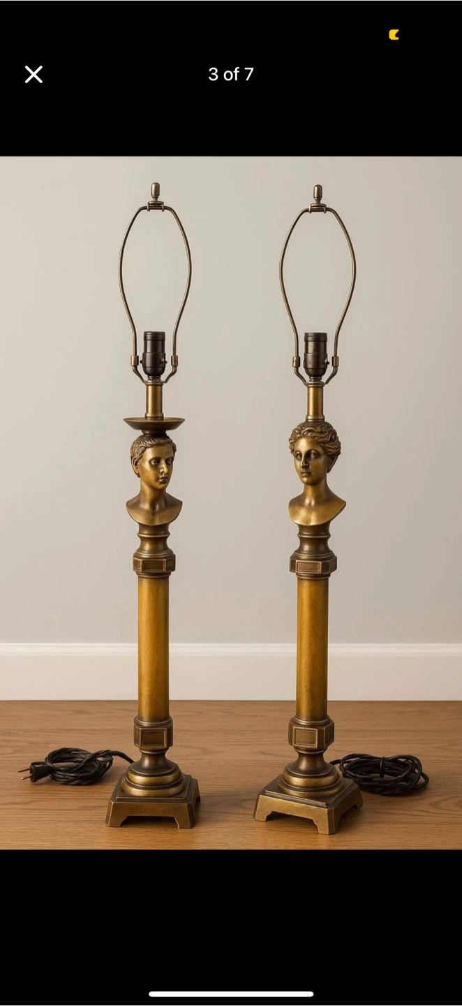Selling a pair of bronze-coloured table lamps. They feature a unique bust design and would add a touch of elegance to any room. They're in great condition and ready to brighten up your space!