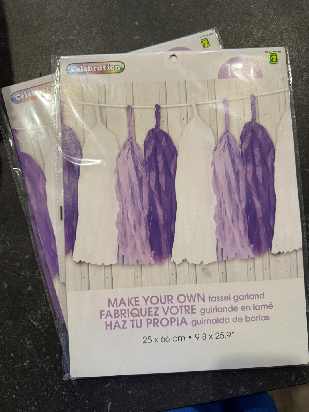 This kit allows you to make your own tassel garland. The package contains purple and white tassels. The garland measures 25 x 66 cm or 9.8 x 25.9 inches