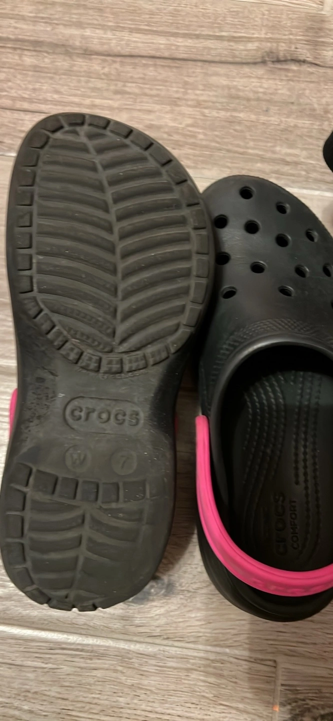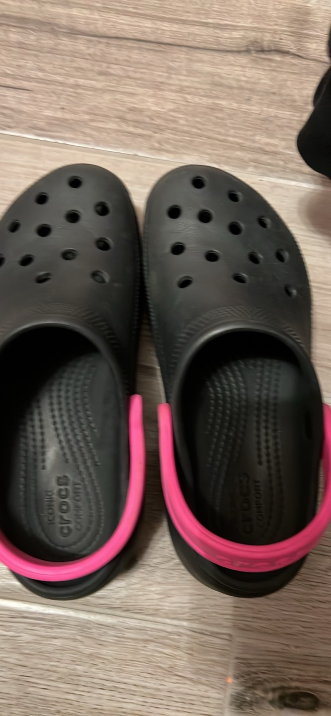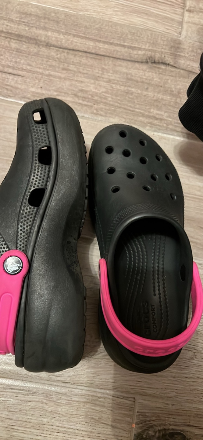 Selling a pair of Crocs Classic Platform Clogs in black with a pink back strap! They are in great condition and super comfy. Size is a women's 7.