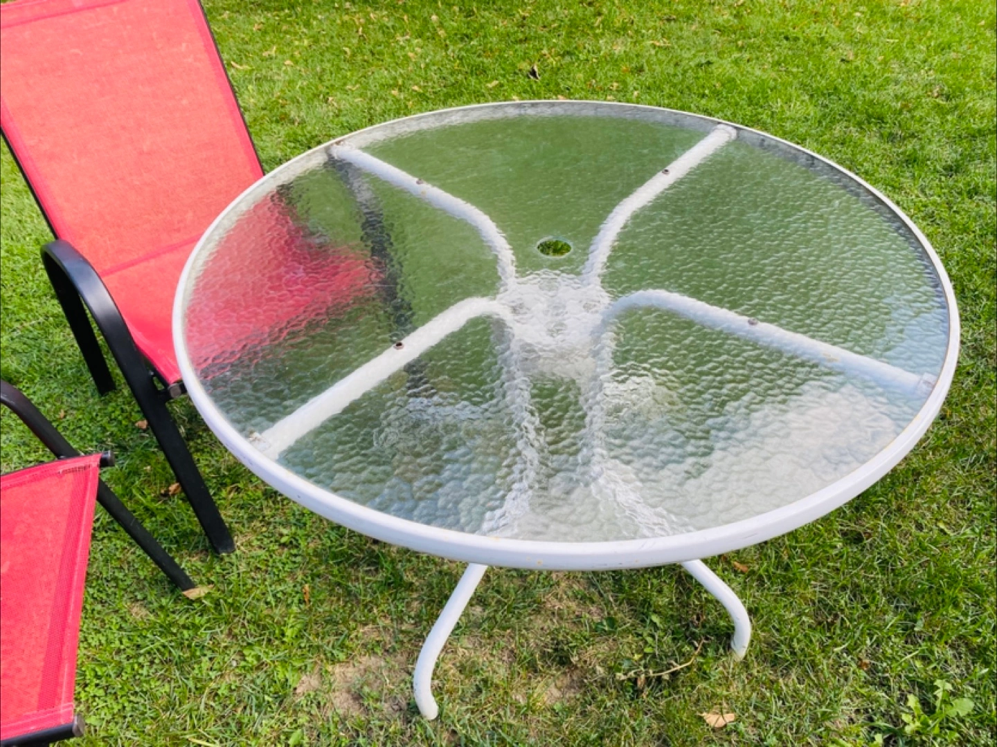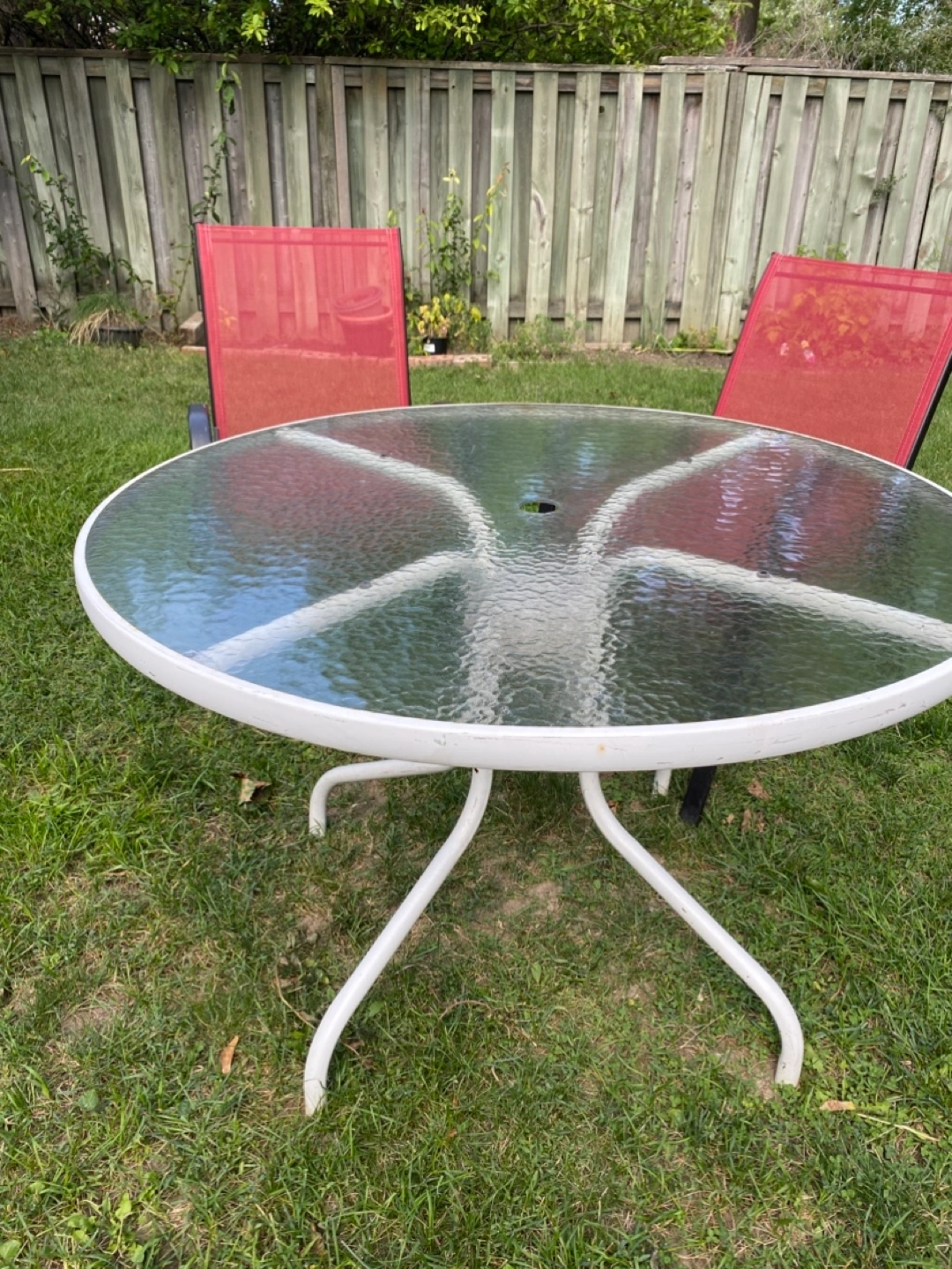 Selling a used outdoor patio set. It includes a round glass table with a white frame and two red chairs with black armrests. The set shows signs of wear from being outdoors, but it's still functional for enjoying your backyard or patio. Chairs are free