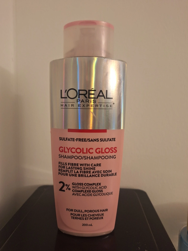 I'm selling a bottle of L'Oreal Paris Hair Expertise Glycolic Gloss Shampoo. It's sulfate-free and designed to fill the hair fibre with care for lasting shine. Ideal for dull, porous hair. The bottle contains 200ml of shampoo!