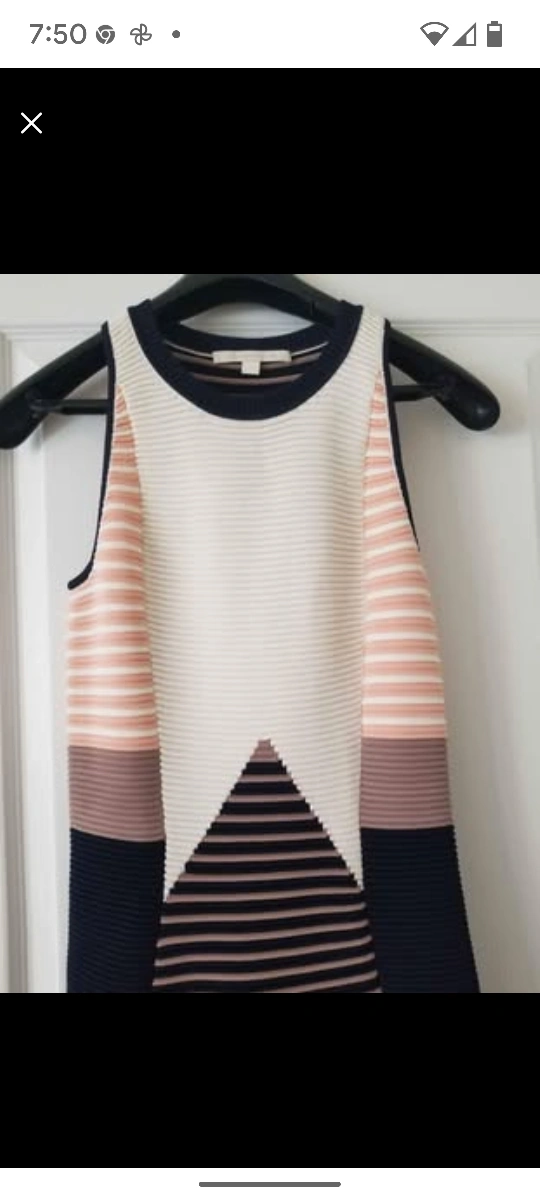 Elegant Sleeveless Rib Dress by JONATHAN SIMKHAI Ribbed knit calls out the curve-skimming, close fit of this dress designed with sophisticated details. Jacquard rich fabric. Color and texture block design with ivory , peach, brown and navy stripes. Sleeveless and a feminine high scoop neckline. Size XS, has a good give to it. Retails for $500+. Worn once to a bridal shower. Comes from a very clean, smoke free home. Pickup in Richmond Hill, south of Stouffville rd between yonge and Bathurst street.