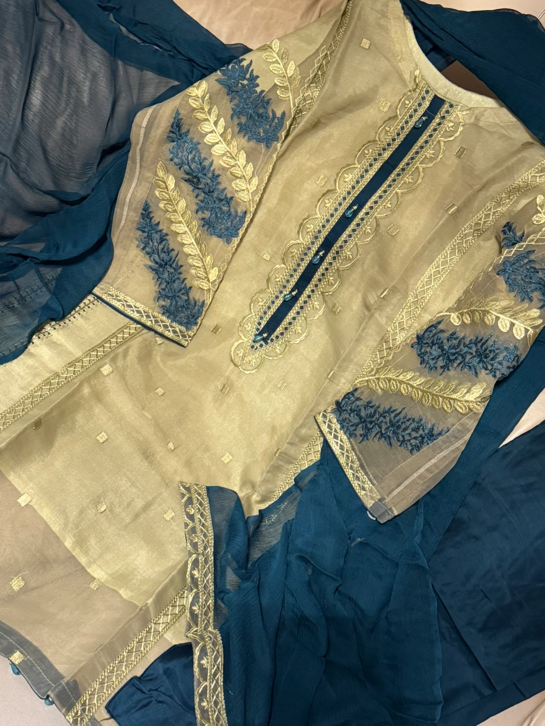 Beautiful shalwar kameez suit with intricate embroidery! The fabric has a lovely sheen, and the embroidery features gold and blue floral designs. Perfect for a special occasion or festive event