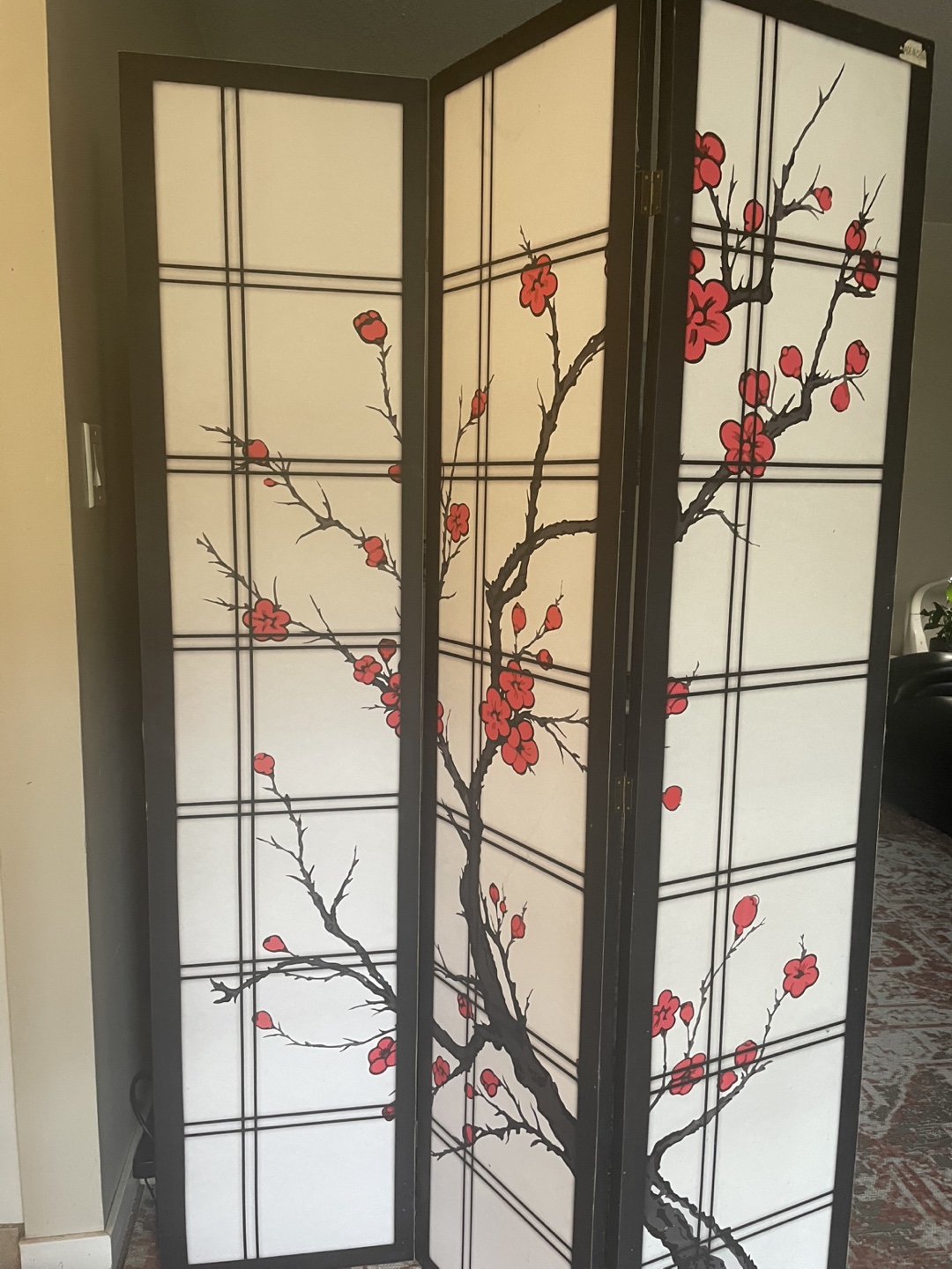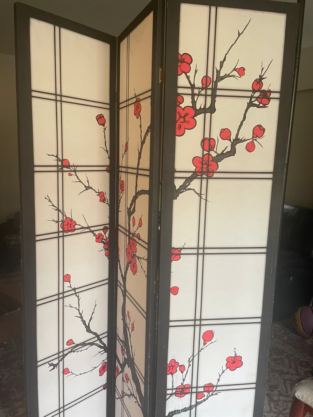Folding room divider featuring a beautiful floral design. It's perfect for adding a touch of elegance to any room or creating a private space. It is in great condition and ready to use in your home or office. A little water stained.