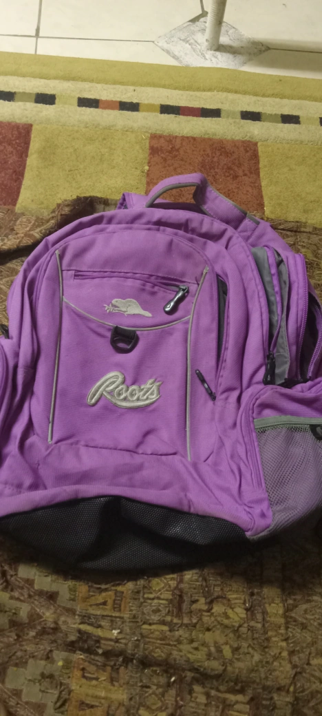 purple Roots backpack. It has multiple compartments and is in good condition. Perfect for school or travel!