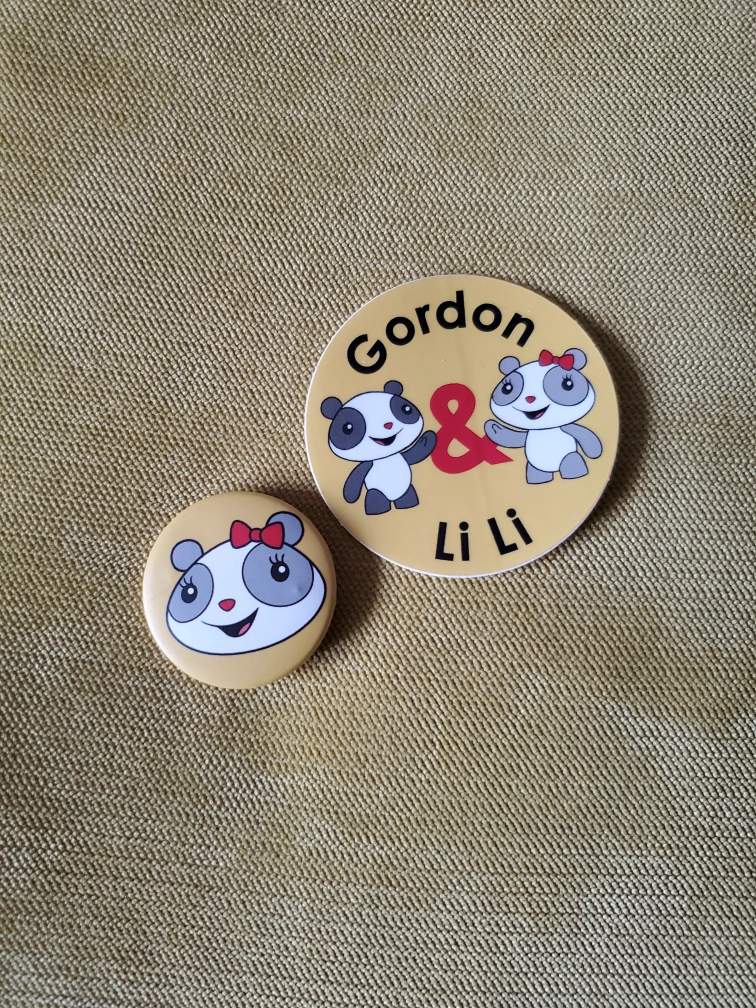 cute pin n sticker featuring Gordon & Li Li pandas. One is a larger sticker with both pandas and the names 'Gordon & Li Li'. The other is a smaller pin featuring Li Li with a red bow.
