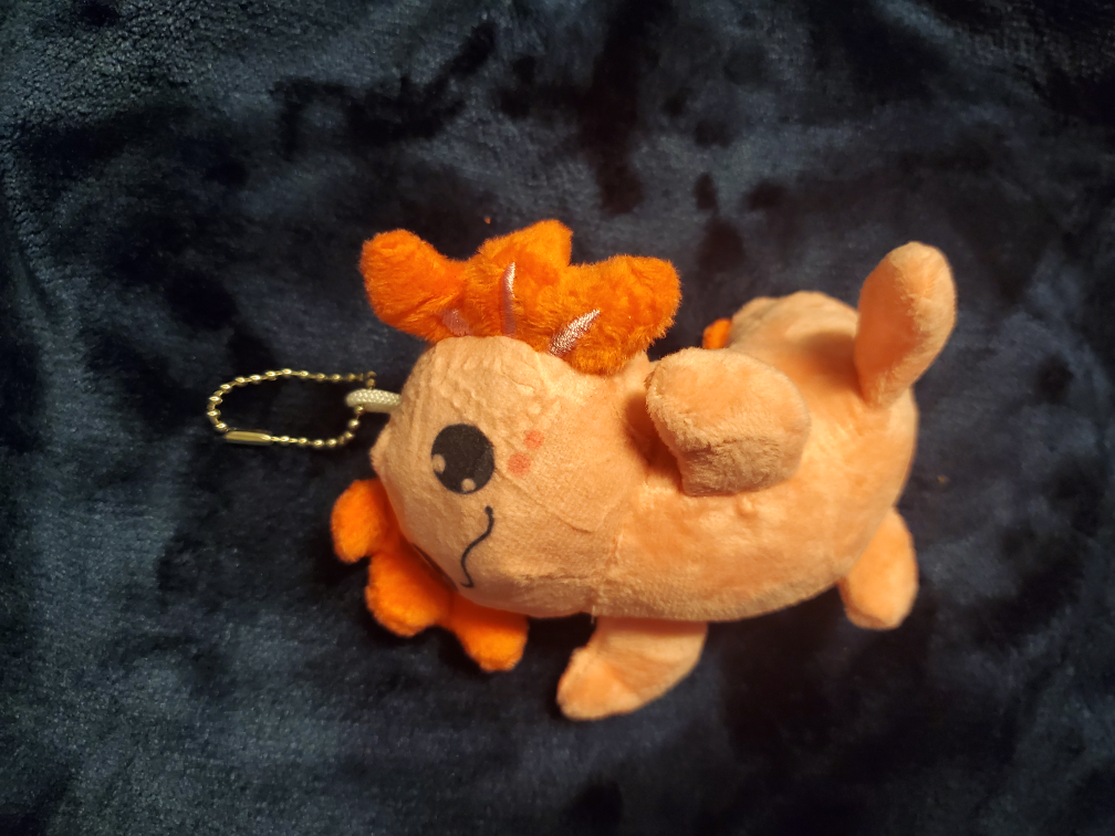 This is a super cute orangey pink plush keychain! It's in great condition and ready to add some fun to your keys or bag. It has a little chain to easily attach to anything!