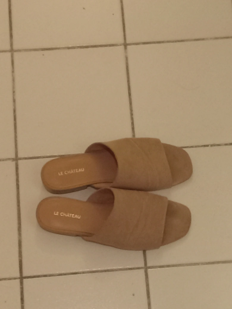 These are a pair of Le Chateau slides in a neutral beige colour. They are a European size 39. These comfy slides are perfect for slipping on and off!