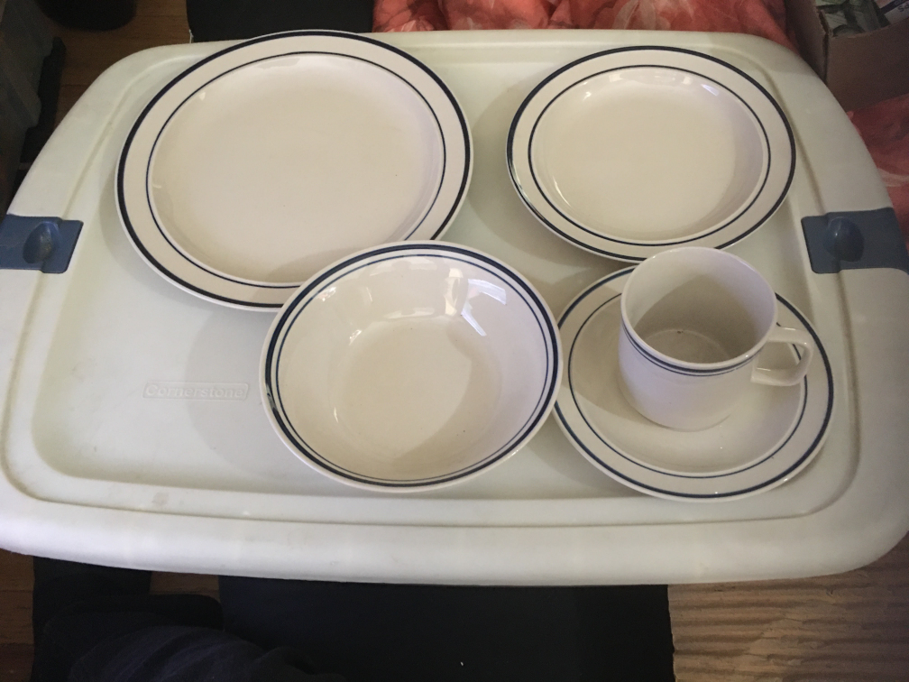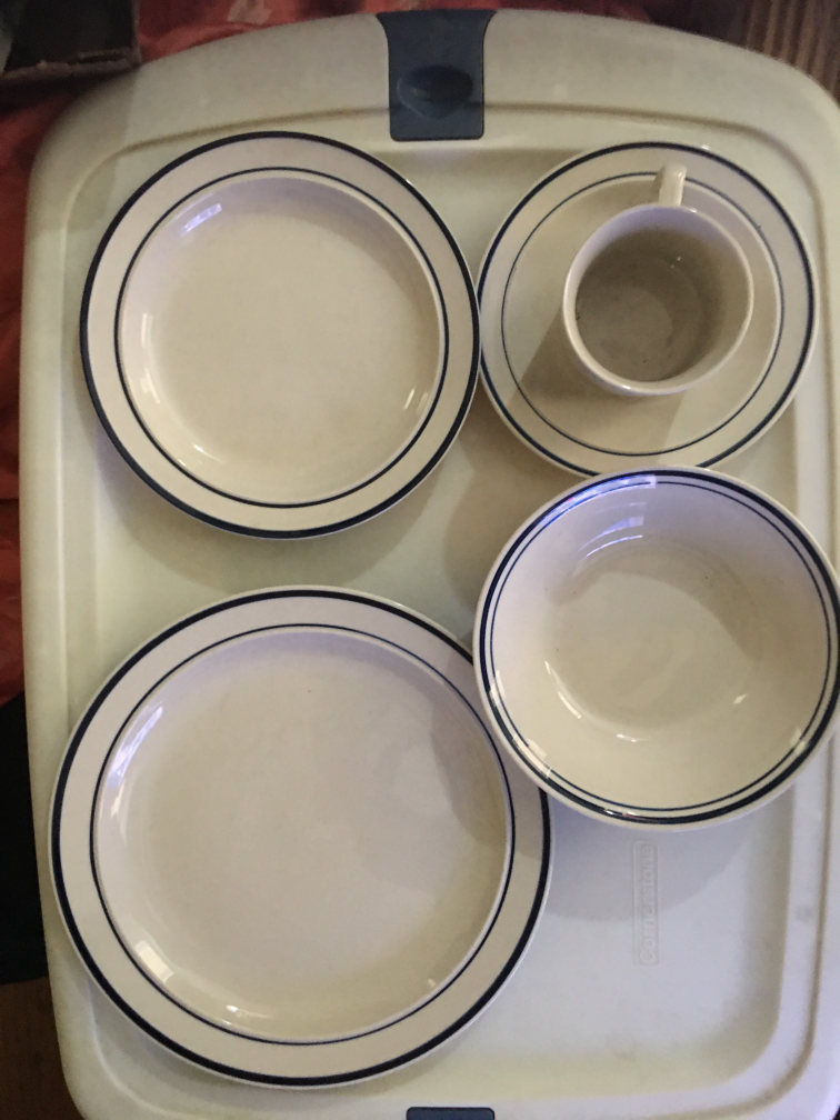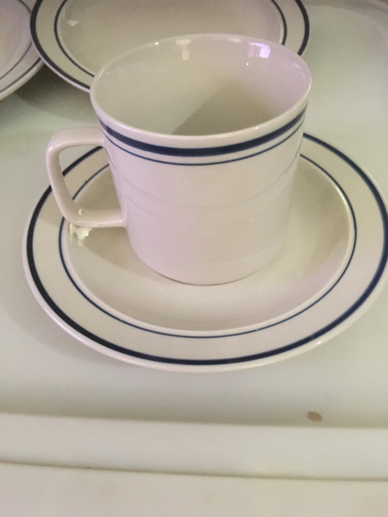 Selling a stoneware dinnerware set! Includes plates, bowls, and cups, perfect for everyday use. The set features a simple yet elegant design with a blue trim. Never been used.2 coffee cups are missing.Includes 8-10 1/4” dinner plates,8-7 3/4” dessert plates,8-7” soup bowls,6-3” coffee cups and 8-saucers.6 full sets.