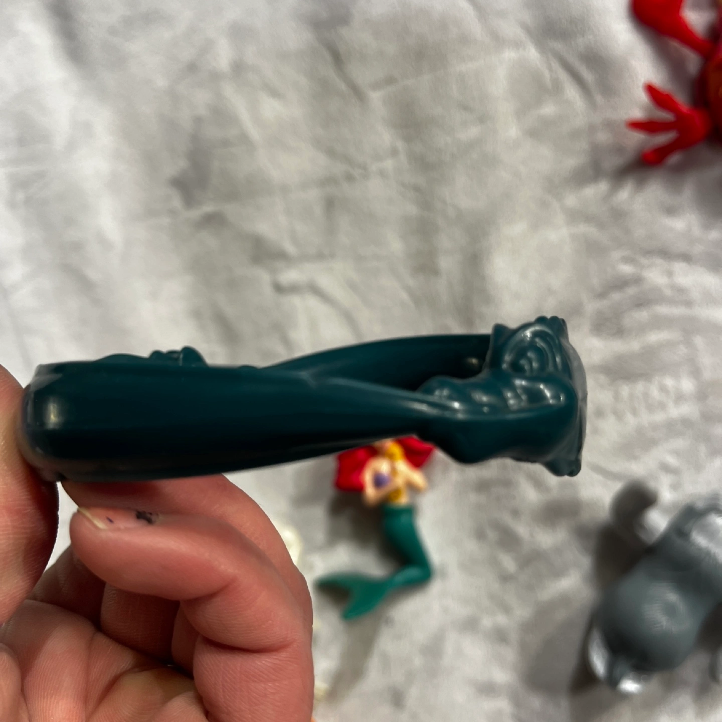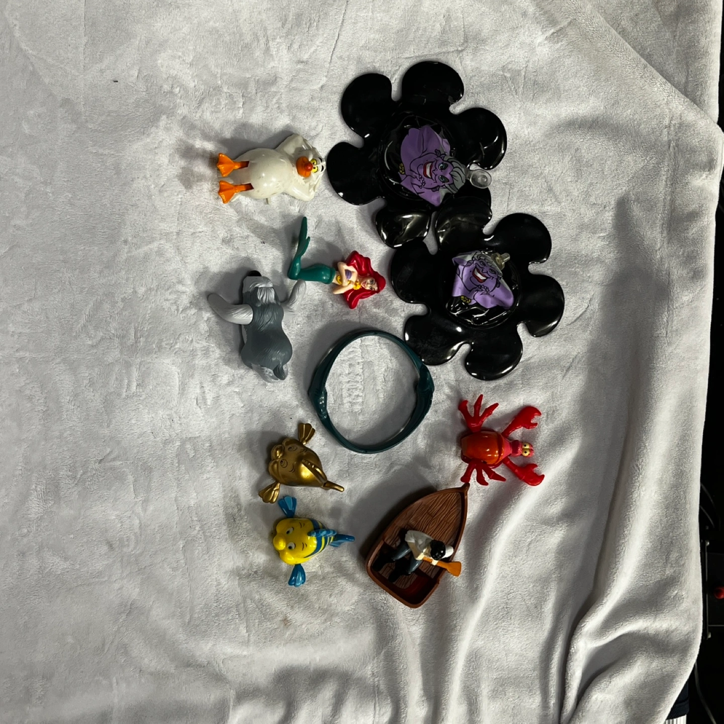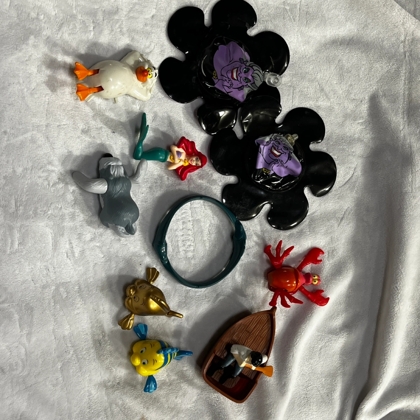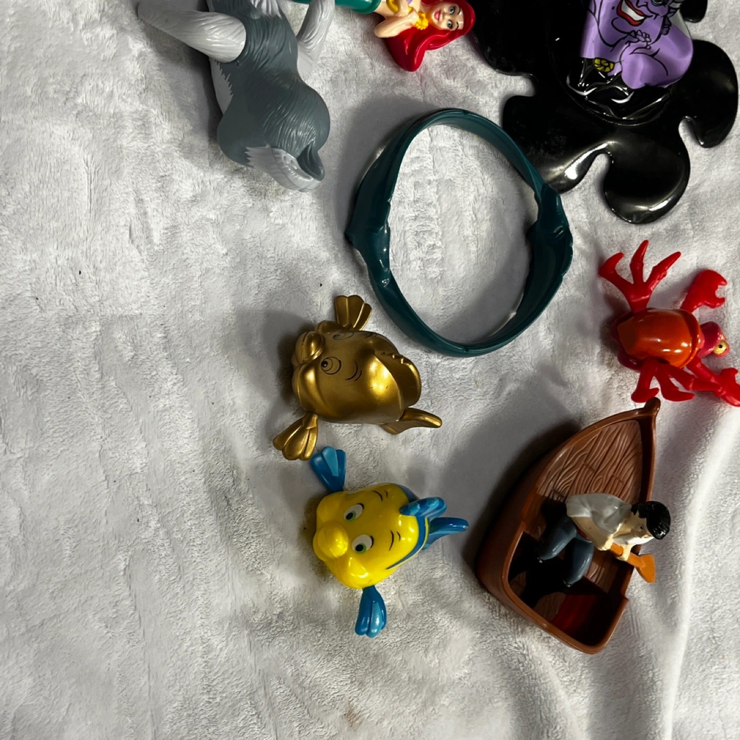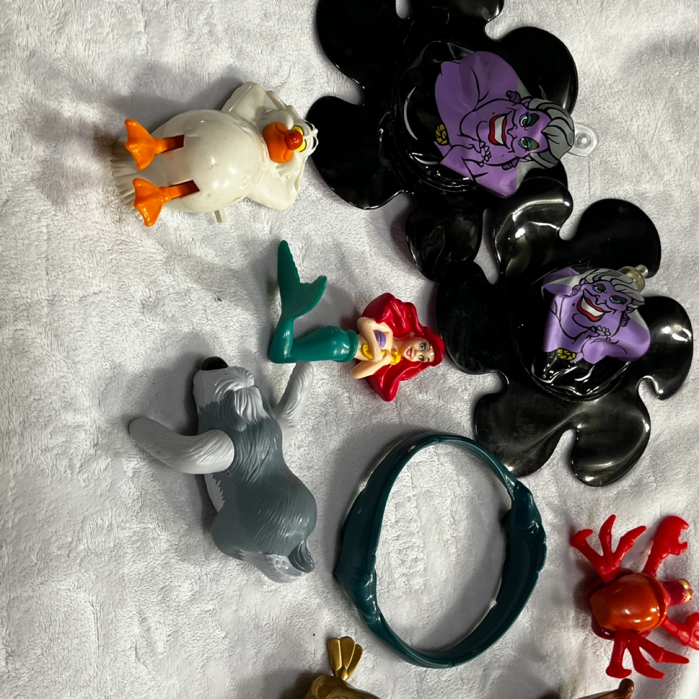 Selling a collection of Disney's The Little Mermaid toys from McDonald's! These are great for collectors or kids who love the movie. Includes Ariel, Flounder, Sebastian, Scuttle, Ursula, and a boat with a the prince character and the shark. They're in good condition and ready for a new home