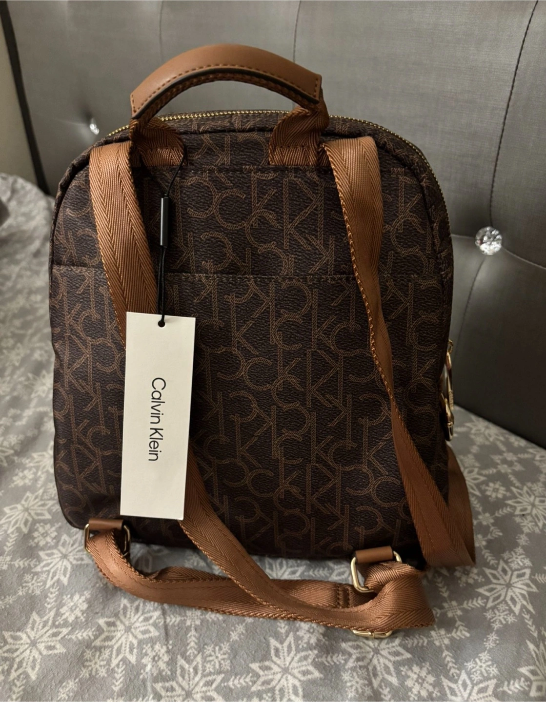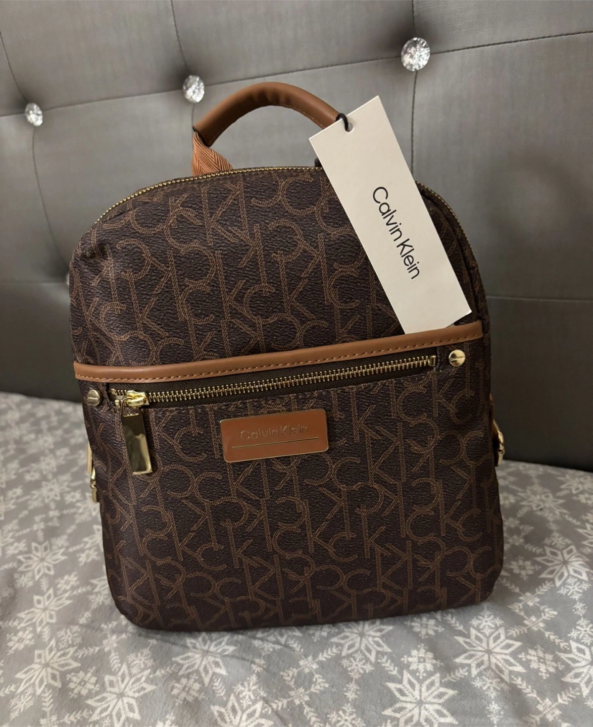 Selling a cute Calvin Klein mini backpack! It features a brown logo pattern and brown straps. It's perfect for carrying your essentials in style. Great for everyday use or travel!