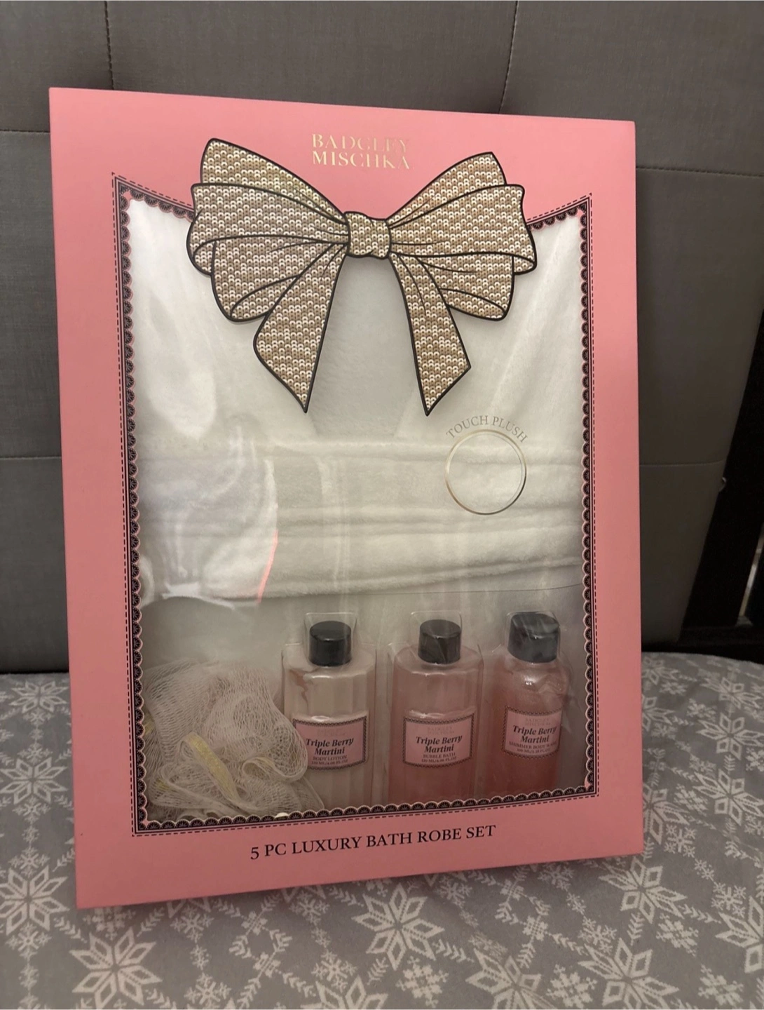 Selling a Badgley Mischka 5-piece luxury bath robe set! The set includes a plush robe and three bottles of Triple Berry Martini scented body lotion, shower gel, and body scrub, plus a bath pouf. Perfect for a spa day at home!