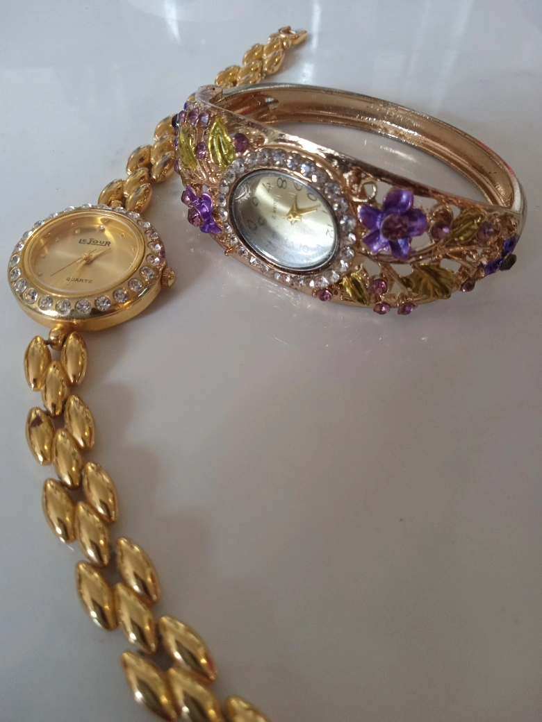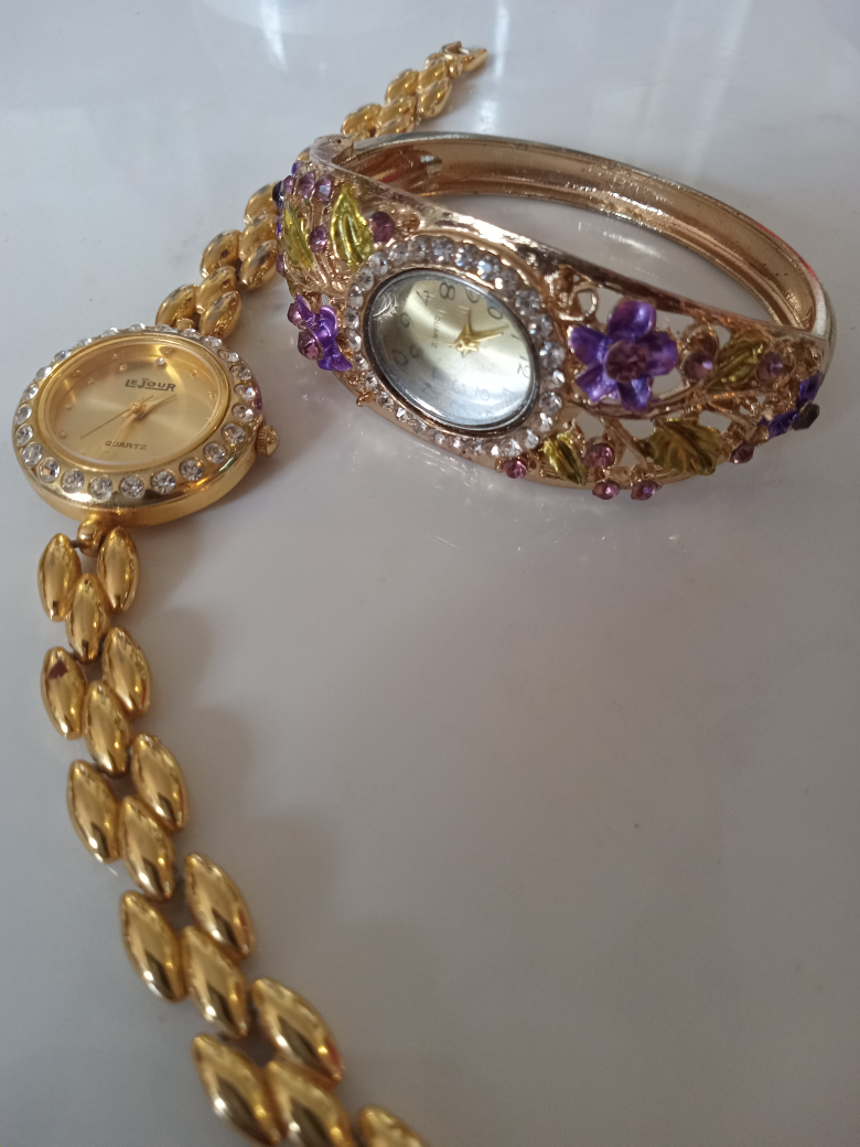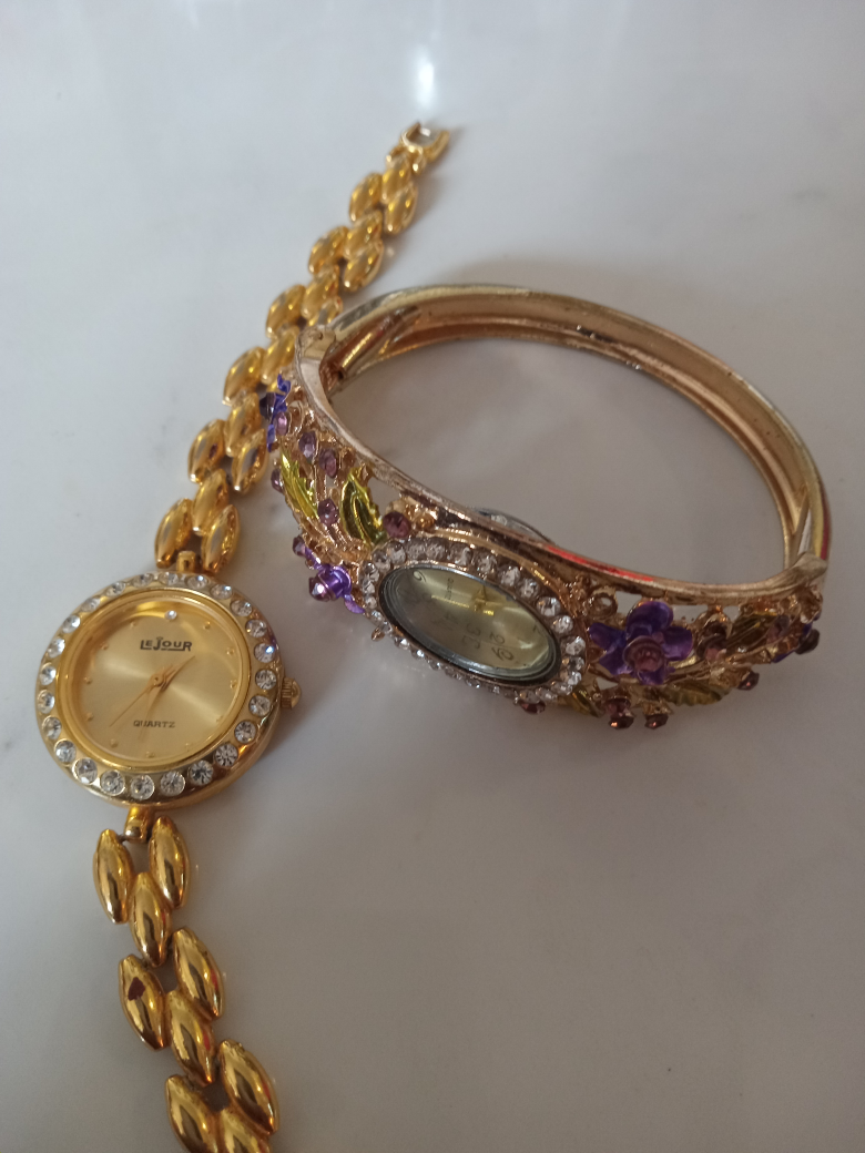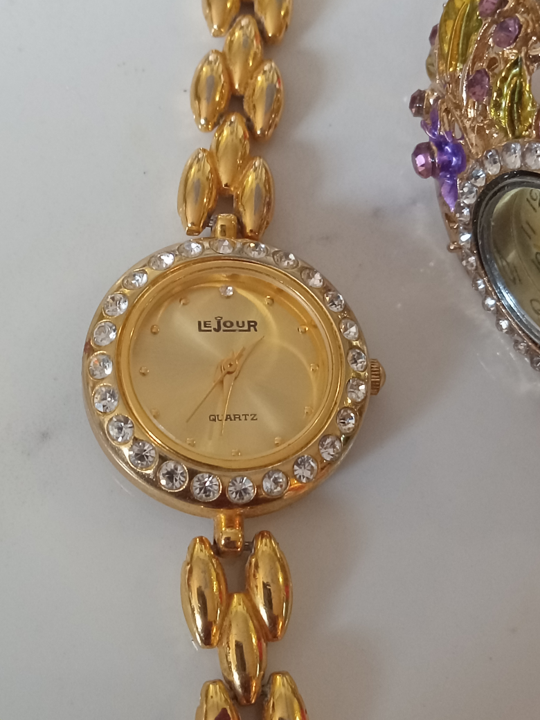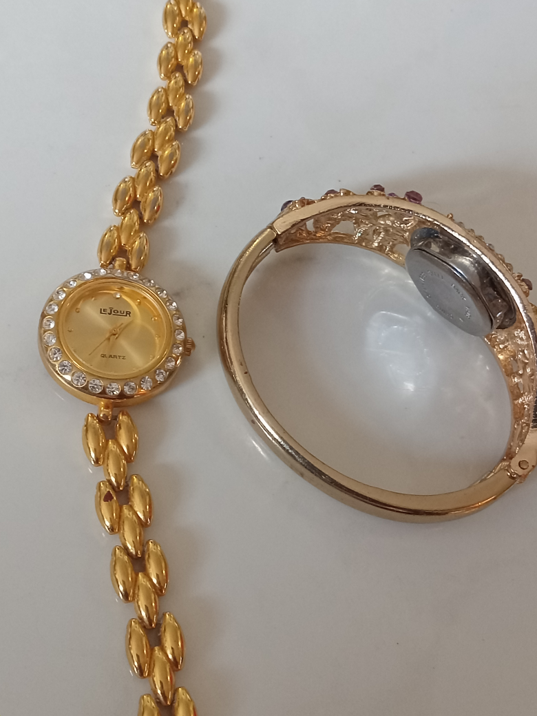 Selling a lovely Le Jour Quartz watch set. The set includes a gold-tone bracelet watch and a decorative bangle watch. Both are in great condition and ready to accessorize your outfits!