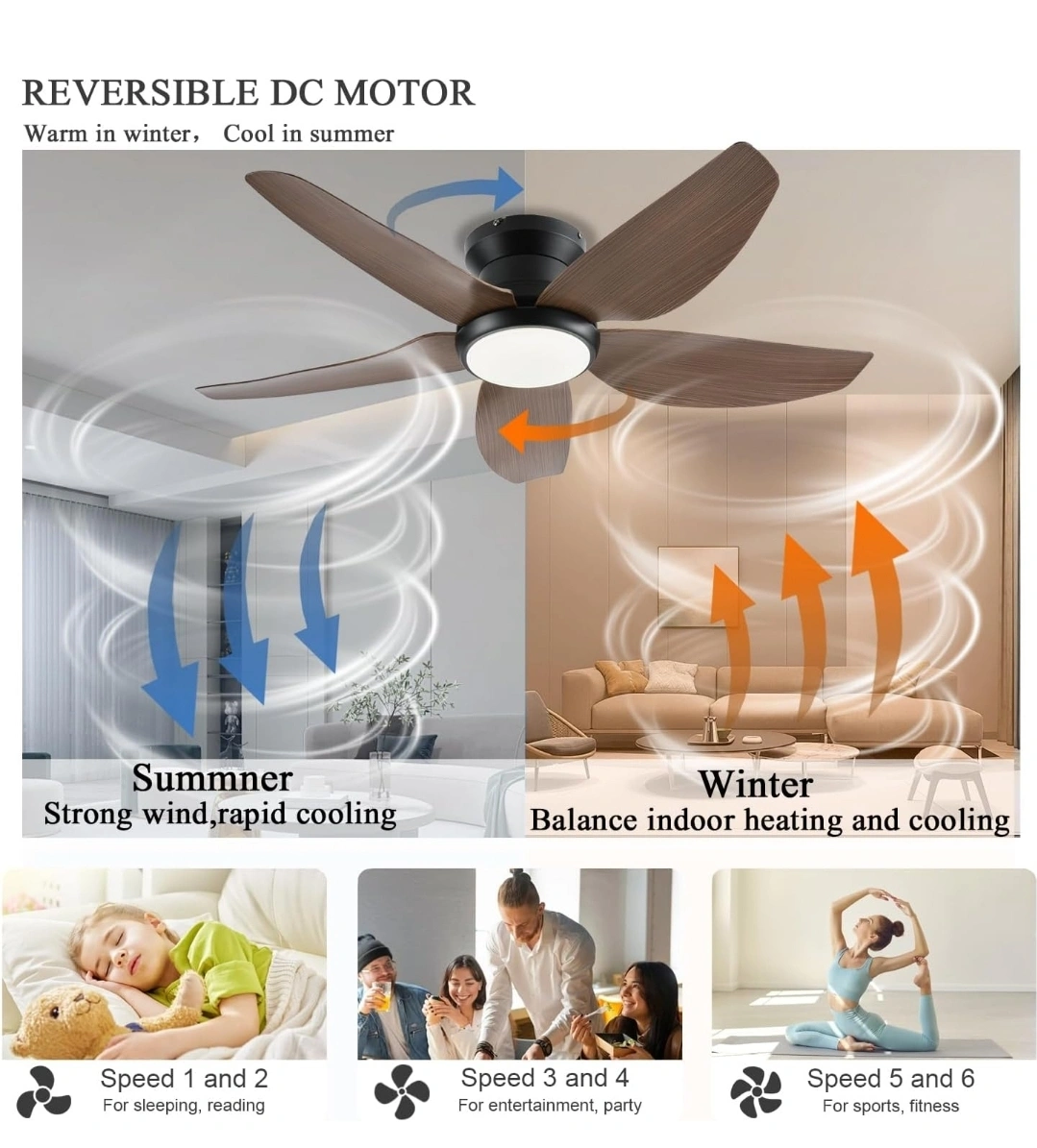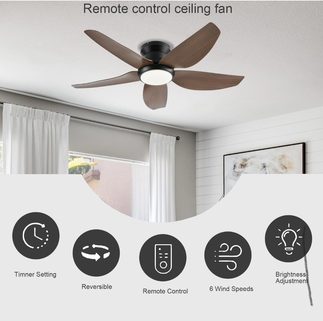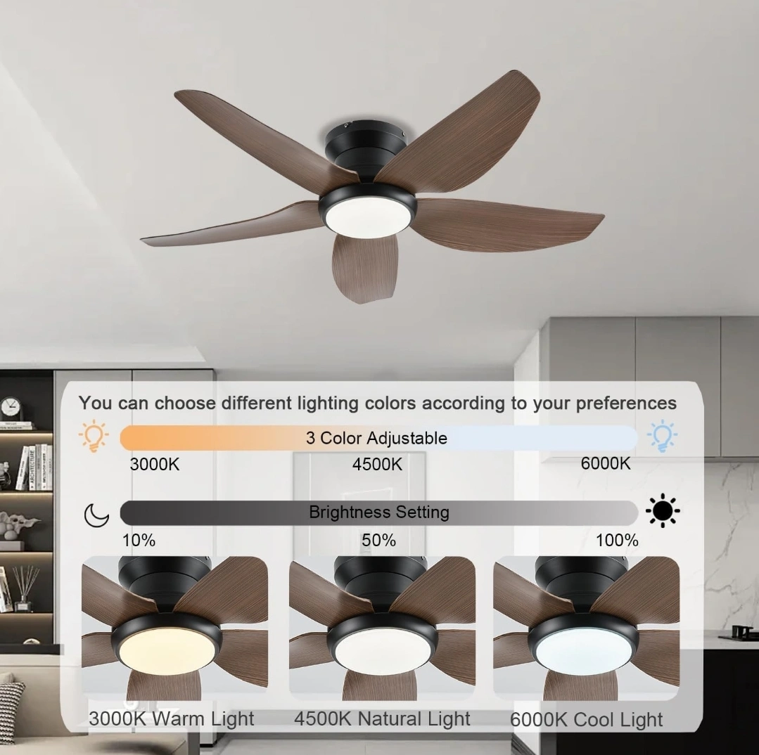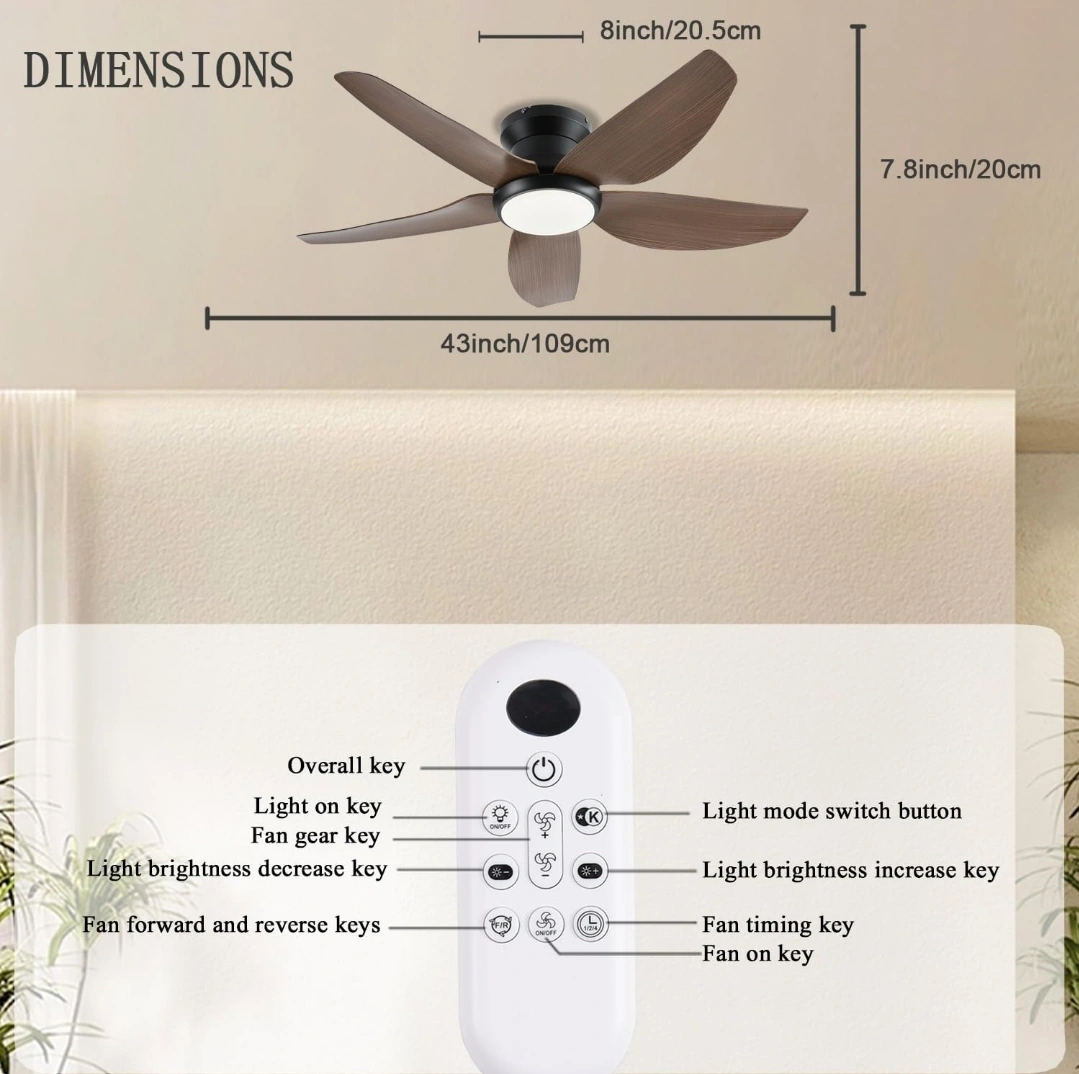 183This ceiling fan comes with a remote control for easy operation! It features: - Timer setting - Reversible direction - 6 wind speeds - Brightness adjustment - 3 color adjustable lighting (3000K, 4500K, 6000K) Enjoy a noiseless experience with this fan!