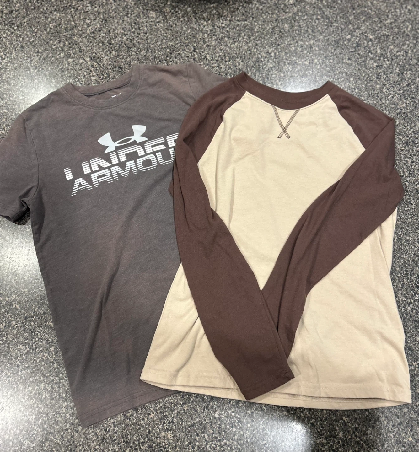 I have two shirts for sale. One is an Under Armour t-shirt, and the other is a long sleeve shirt with brown sleeves and an off-white body