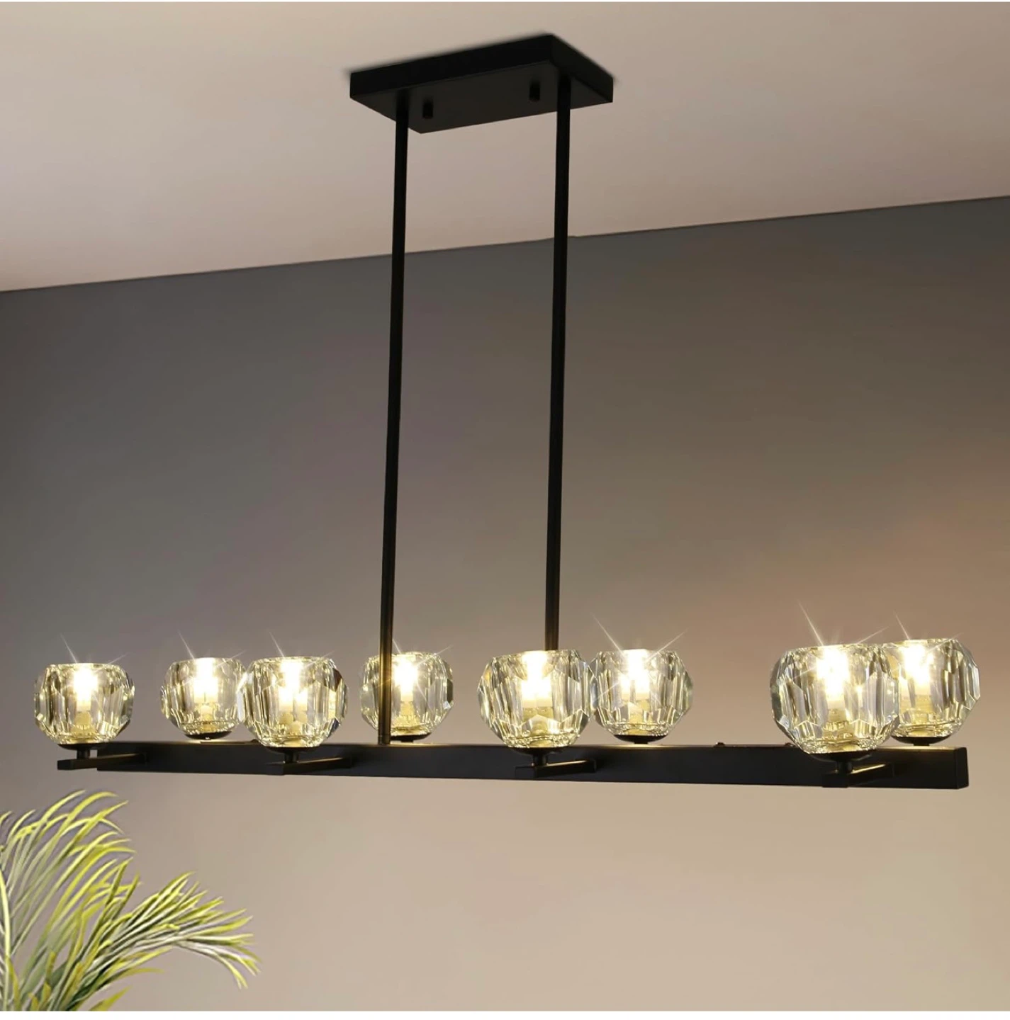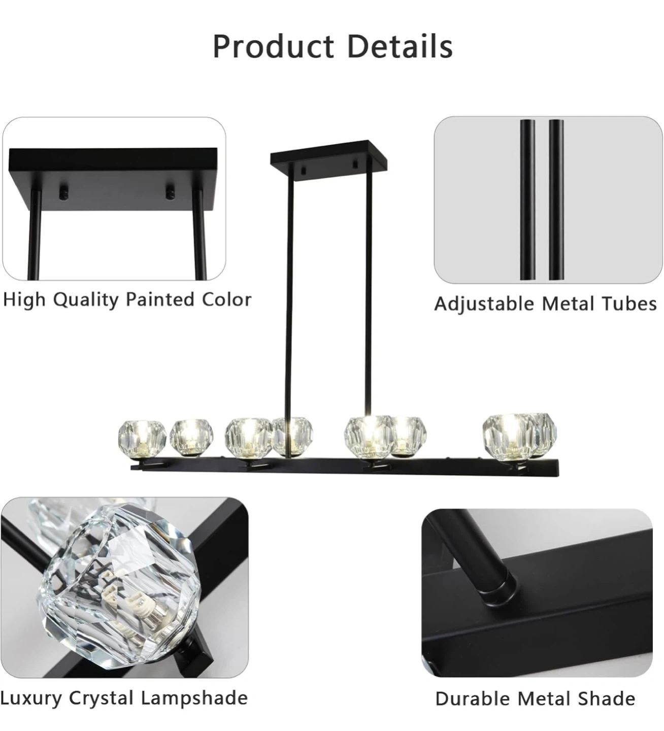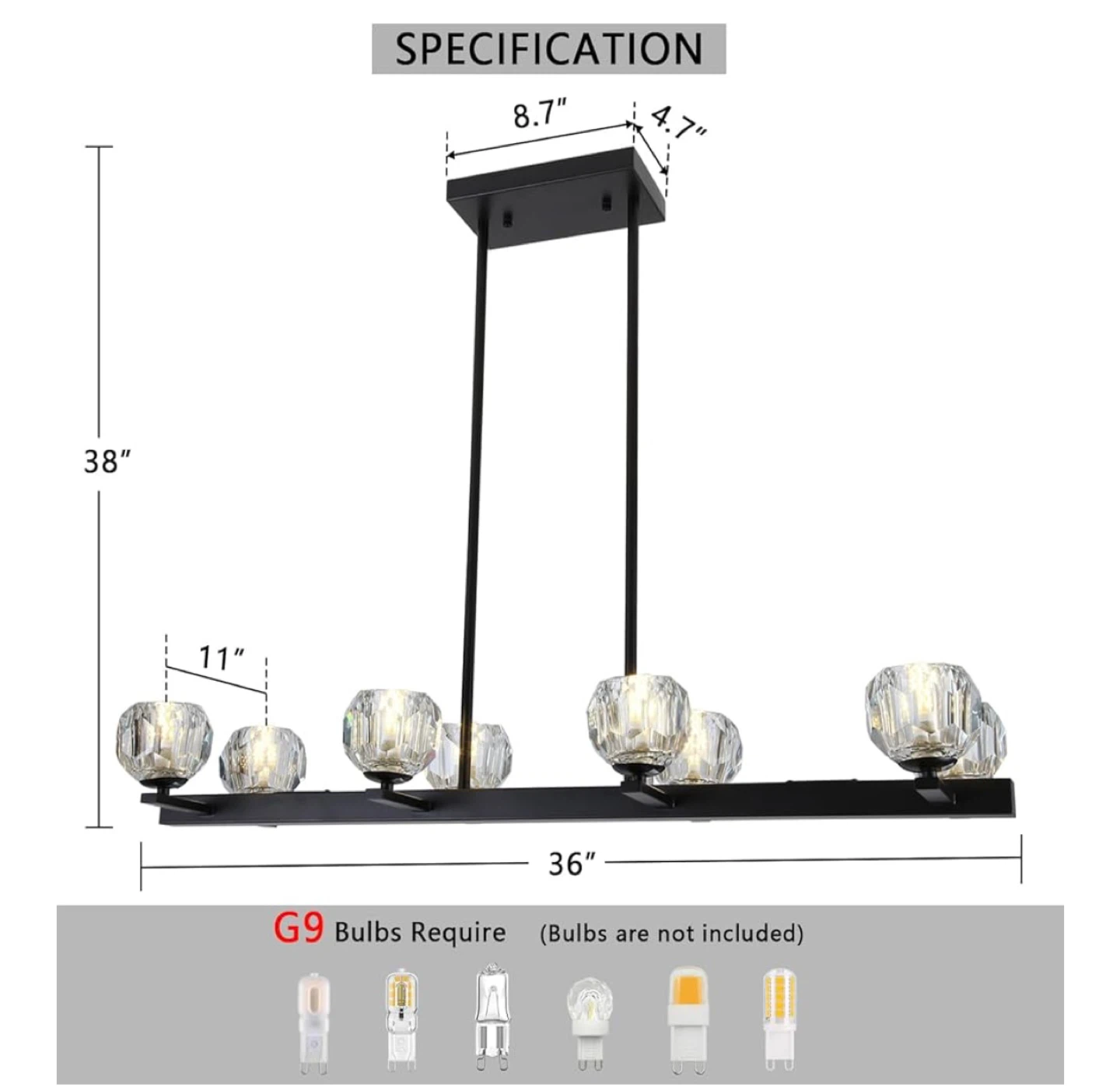 Selling a brand new black 8-light crystal pendant lighting fixture! It's still in its original packaging and includes all the components. This stylish light fixture requires G9 bulbs (not included). The dimensions are: 38" height, 36" width, 8.7" length, and 4.7" width.