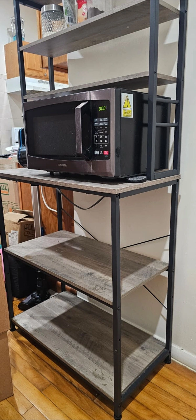 Toshiba microwave- $60 shelving unit- $50 Both- $110 The microwave is in good working condition. The shelf has a metal frame and wooden shelves.