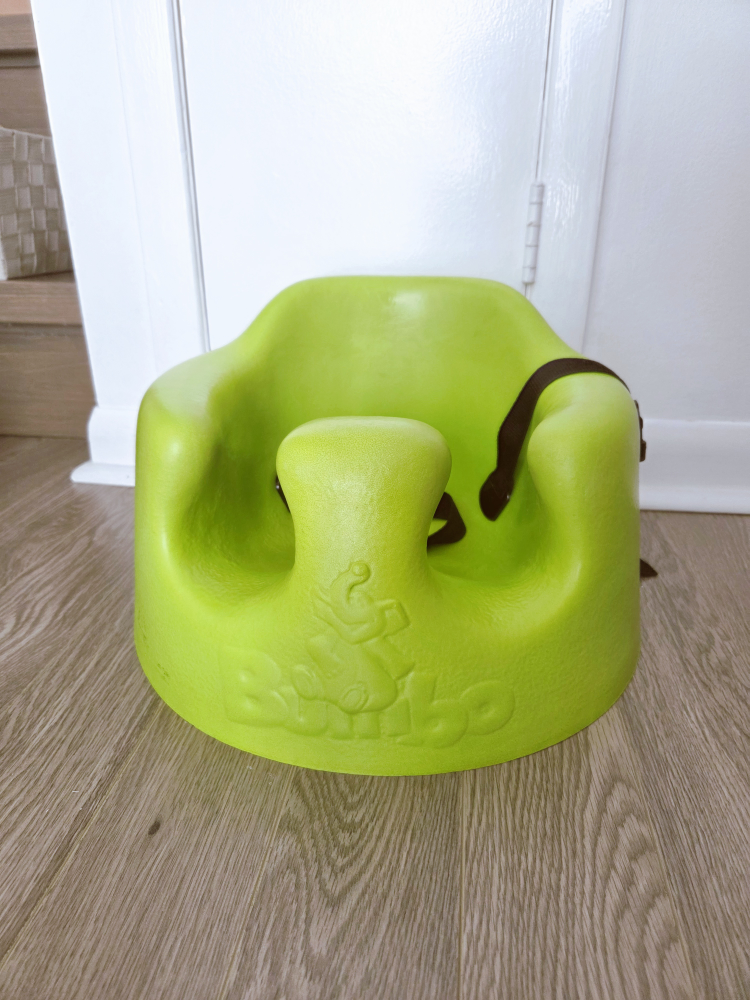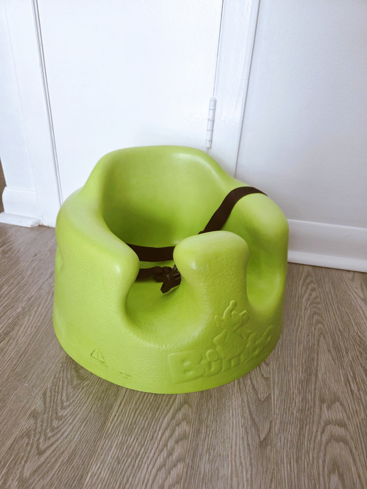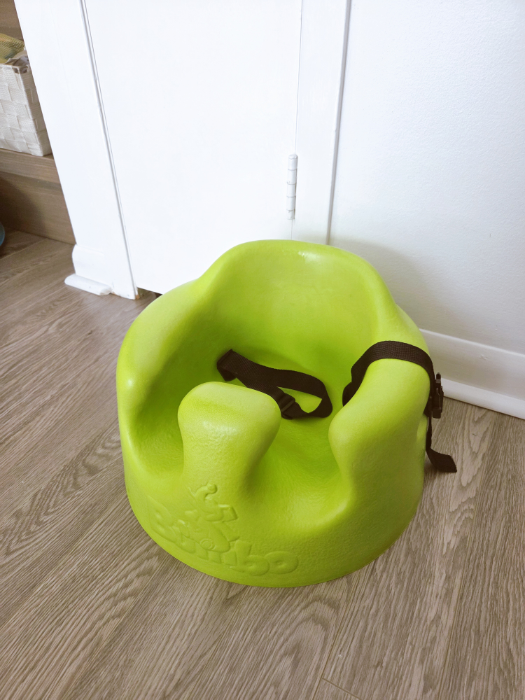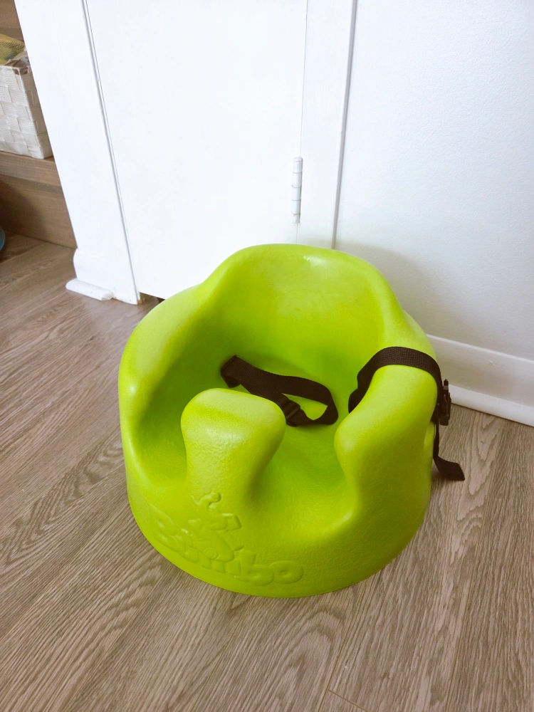 Selling a Bumbo floor seat in a vibrant green colour. It's perfect for helping your little one sit up and explore the world around them! This seat is designed to provide support and comfort for babies as they learn to sit. It has a safety harness to keep your baby secure
