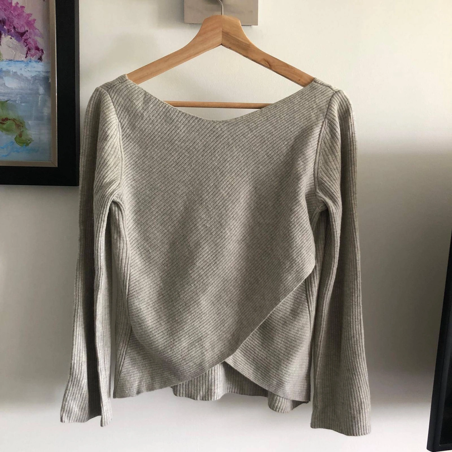 Lightweight grey ribbed knit sweater, with boat cut neckline and long sleeves. Made with a wool blend material, so very warm and features an interesting cross-back detail. Sweater length ~approximately at hip length (not cropped).